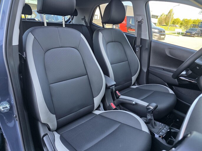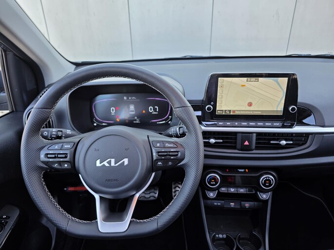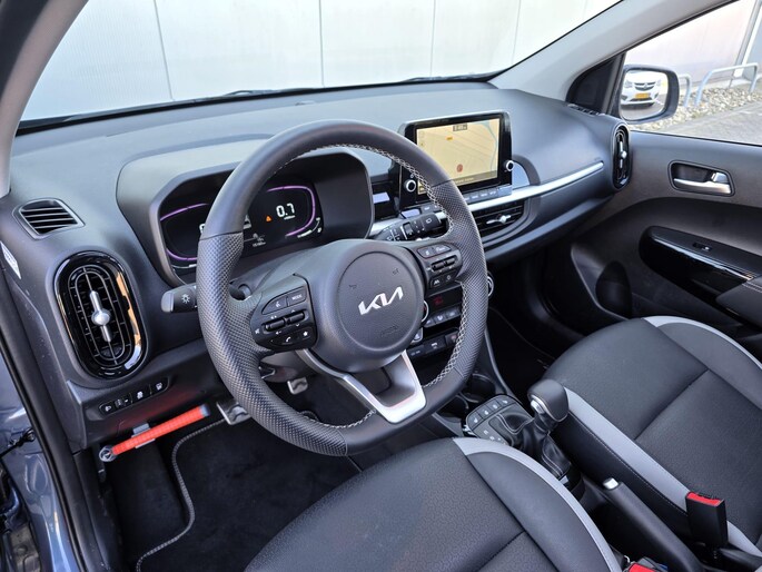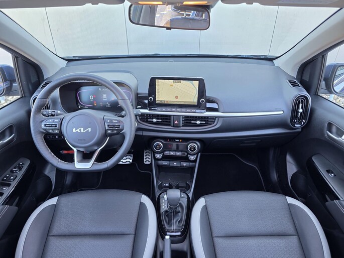 Binnenin de Kia Picanto GT-Line vinden we een modern en ergonomisch vormgegeven interieur. De sportstoelen met kunstlederen bekleding bieden voldoende ondersteuning en comfort, zelfs bij langere ritten. Het dashboard heeft een overzichtelijke indeling met een 8-inch touchscreen inclusief Apple CarPlay en Android Auto. Het digitale instrumentenpaneel draagt bij aan een high-tech gevoel.