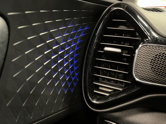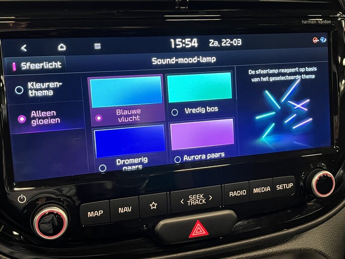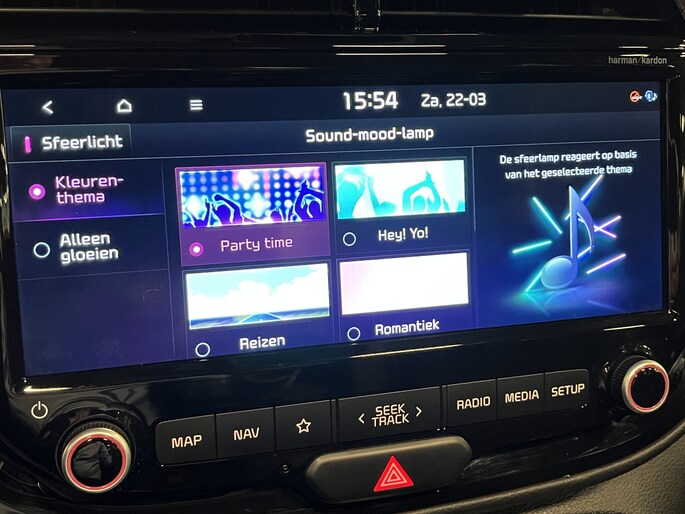 Deze gave feature maakt rijden en reizen in de e-Soul leuker dan ooit. Sfeerverlichting in de portierpanelen reageert subtiel op de beat in je muziek. En dat in naar keuze 8 verschillende kleuren en 6 unieke thema’s die je selecteert in het split-screen navigatiedisplay. Zo veranderen de verlichting en de sfeer in het interieur continu mee met de stijl en intensiteit van de muziek, en met het volume.
