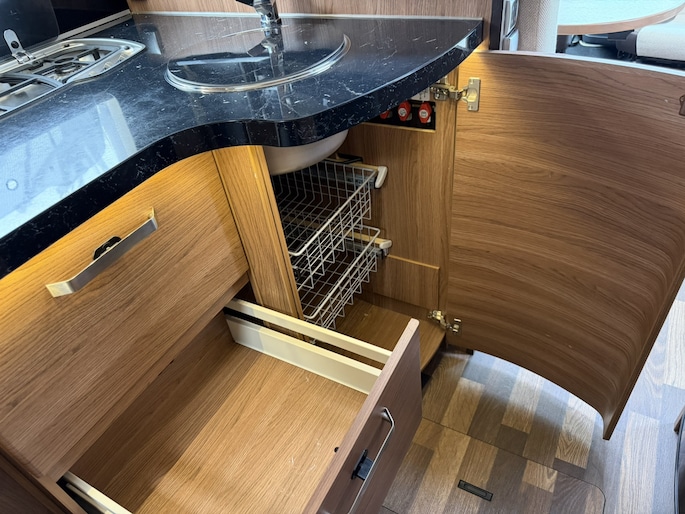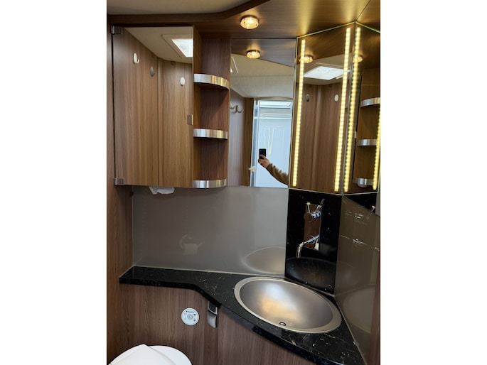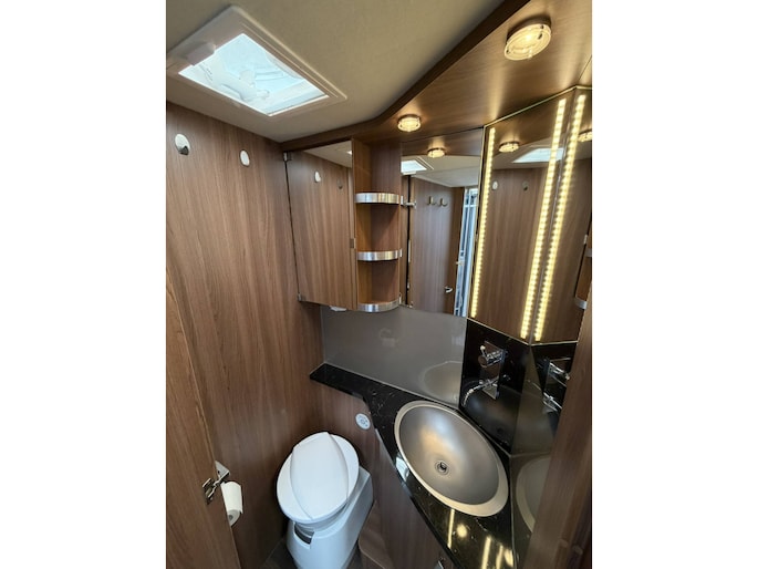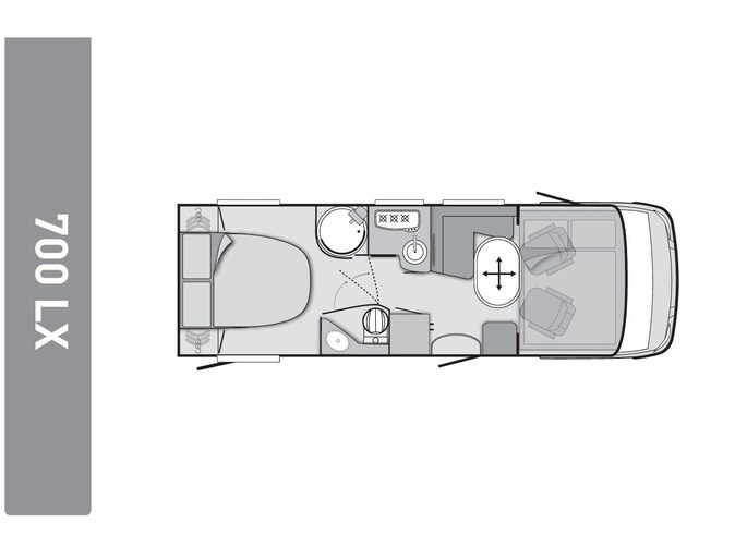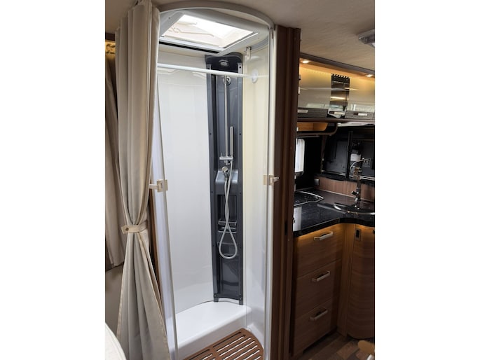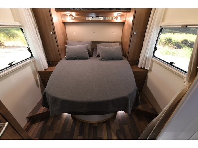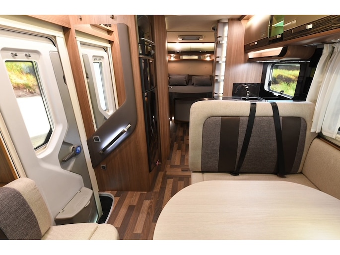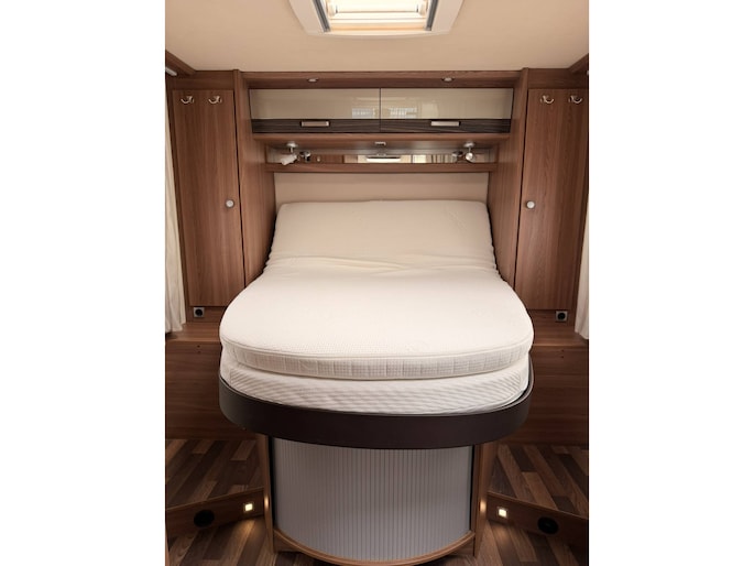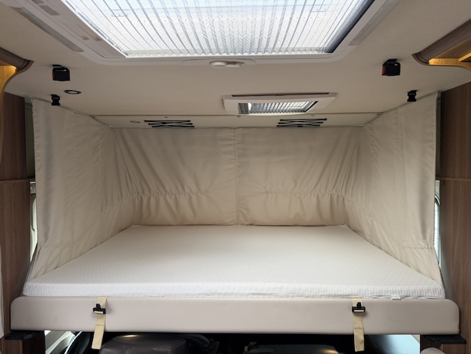 Dankzij het queensbed achterin is dit een super ruimtelijke uitvoering, makkelijk toegang tot het bed van beide kanten en met afsluitbare deur naar het woongedeelte onstaat een eigen slaapkamer met toegang tot toilet en douche.