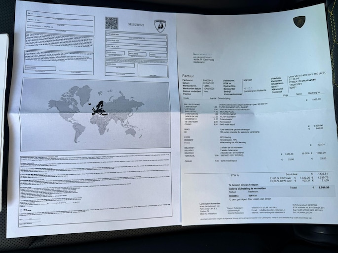 De auto is altijd dealer onderhouden en heeft recent nog een grote onderhoudsbeurt gehad bij Lamborghini Rotterdam, inclusief een uitgebreide 150-puntencheck. Nota van de werkzaamheden is aanwezig. Fabrieksgarantie is verlengd tot mei 2026 en daarna opnieuw te verlengen.