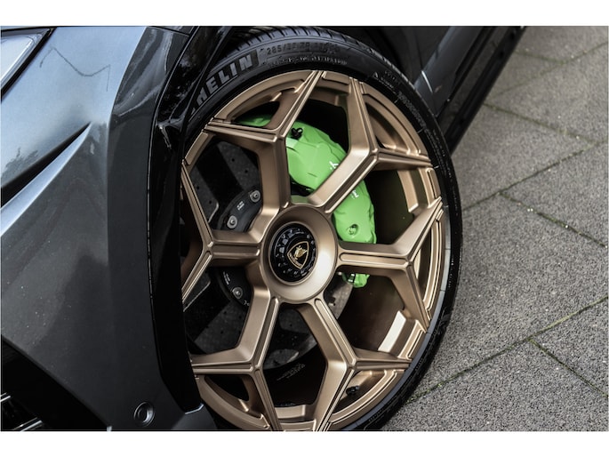*De afgebeelde velgen kunnen we indien gewenst tegen meerprijs leveren. Speciaal op verzoek hebben we deze set custom laten maken, 23 inch forged breedset centerlock look t.w.v. € 13.500,- met Michelin banden Lamborghini codering. Nu voor maar €8.950,- met inruil van de originele set winterset!