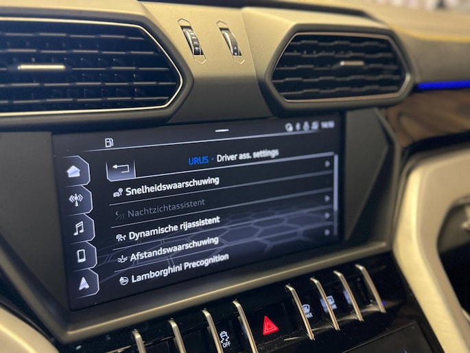 Zoals u mag verwachten van deze Lamborghini Urus is hij uitgerust met een reeks aan actieve veiligheidssystemen. Onbedoeld buiten de rijstrook raken wordt voorkomen door het Lane-keeping systeem. Ook als uw aandacht even verslapt, blijft de forward collision warning bij de wekker. Dreigt er een botsing met een voor- of tegenligger, dan waarschuwt het systeem direct. In het donker ziet de nachtzichtassistent objecten en gevaarlijke situaties voordat u ze met uw eigen ogen ziet. Dankzij veiligheidsvoorzieningen als head-up display, accident avoidance system en bandenspanningcontrolesysteem, bent u steeds veilig onderweg.