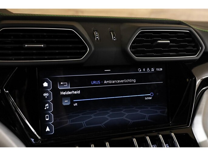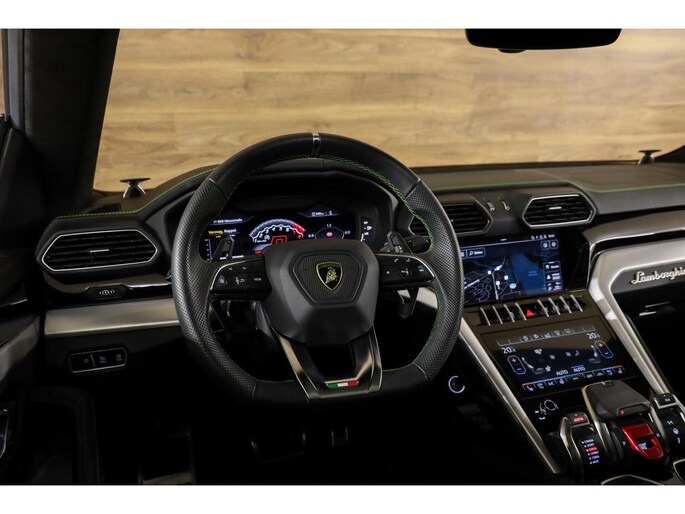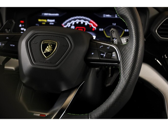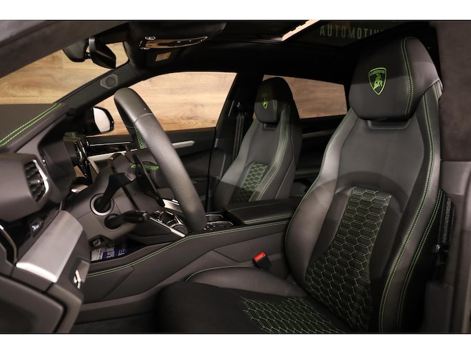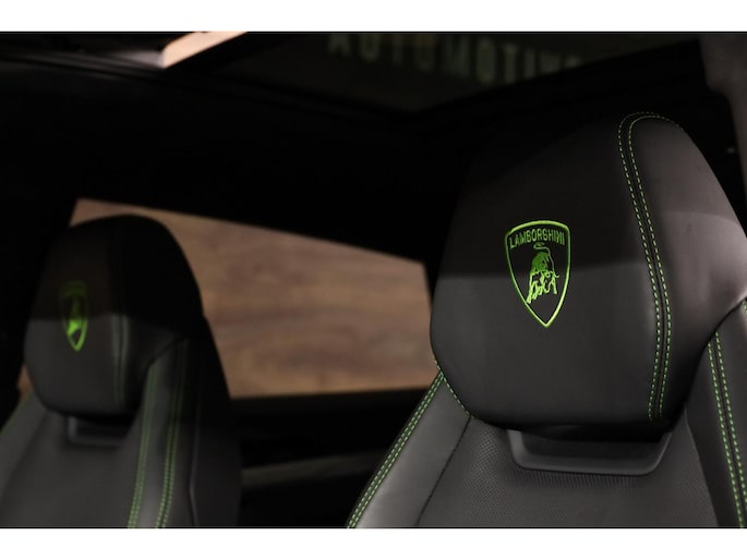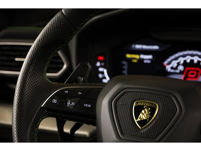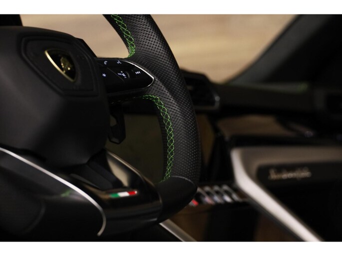 **Deze Lamborghini is rijkelijk uitgerust met alle opties, zoals: 4-Zits uitvoering, Keramische remschijven, Panoramadak, Vol lederen interieur met groene contraststiksels, Groene remklauwen, Elektrisch verstelbare voorstoelen met geheugen, Elektrisch verstelbare achterstoelen, Dodehoekdetectie, Stoelverwarming voorin en achterin, Stoelventilatie, Stuurwielverwarming, Luchtvering, Massagestoelen, Head-up display, High-end Bang en Olufsen audiosysteem (Advanced), Climate control voorin & achterin, Adaptieve cruise control, 22-inch lichtmetalen velgen, Schakelmogelijkheid aan stuurwiel, Full map navigatiesysteem, Multimedia, Parkeercamera, 360-Camerasysteem, Parkeersensoren voor & achter, Ambienteverlichting, Lane assist, Zwarte pianolak interieurafwerking, Lederen dashboard met contraststiksel Standkachel etc.