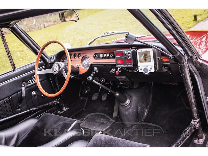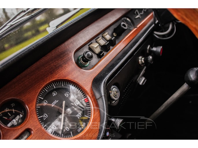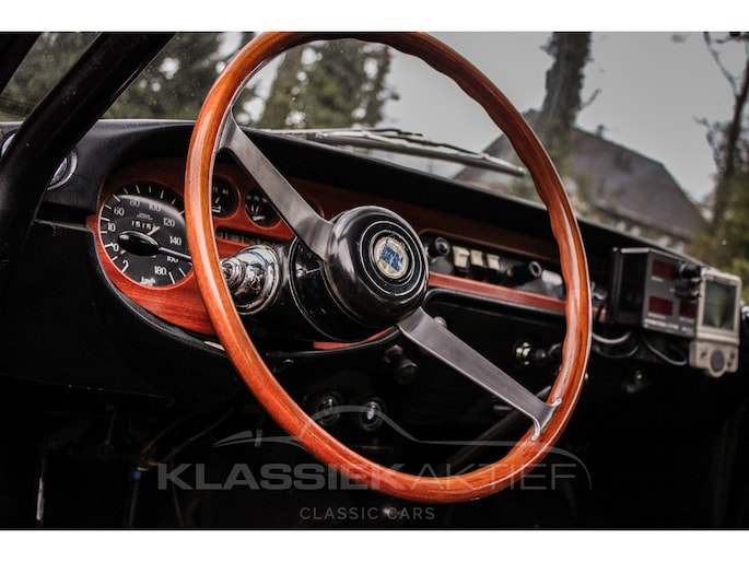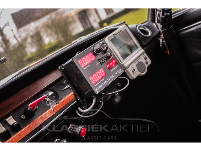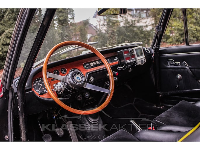 The interior is also in good condition. The black leather sports seats are sturdy and (with some signs of wear) in good condition. This Lancia Fulvia Coupe is equipped with a rally trip master, roll cage, reading light, etc. In short, all the useful tools for intensive rally use. The dashboard is in good condition, and the wooden dashboard and wooden steering wheel are not only in good condition but also stunning to look at. The various chrome and trim pieces in the interior are also in good condition.