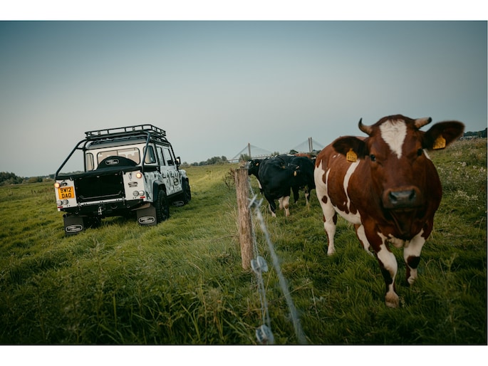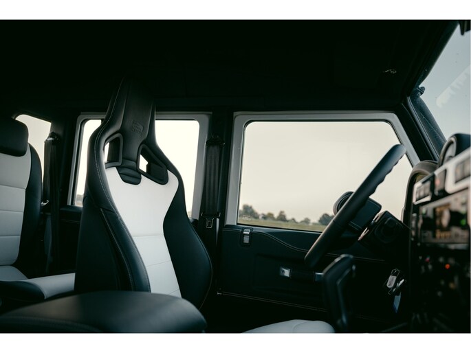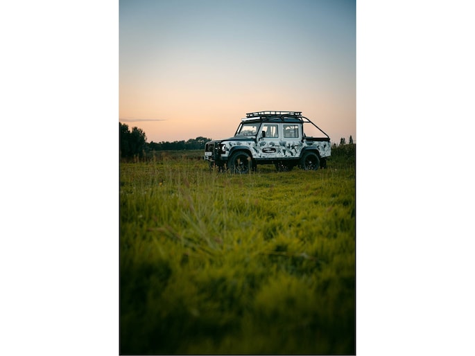 Dit voertuig nam onlangs deel aan een driedaagse ultieme off-road competitie-ervaring in Staffordshire. Afgewerkt in Fuji White met contrasterend Narvik Black dak en glanzende zwarte exterieurelementen, en uitgerust met een 5,0-liter benzine V8-motor en een achttraps ZF automatische transmissie, levert de Defender Works V8 Trophy II 405 pk en 515 Nm koppel. Glanzend zwarte 18-inch Sawtooth lichtmetalen velgen worden aangevuld met verbeterde remmen, een ophangings- en handlingkit voor extra rijvertrouwen. De avontuurlijke camouflage bevat de iconische silhouetten van Defender en Series Land Rovers, verborgen tussen de 23 locaties die een rol hebben gespeeld in Land Rovers illustere avonturen en historische off-road uitdagingen. Accessoires zijn onder meer een multi-point rolkooi en ladder, modderbanden, spotlights, verhoogde luchtinlaat, voertuiglier en bodembescherming; kenmerken om de reis van je leven aan te gaan. De Recaro sportstoelen zijn afgewerkt in hoogwaardig zwart en wit Windsor-leer met contrasterende stiknaden, die steun en comfort combineren. De lederen bekleding strekt zich uit tot het dashboard, de deuren en het hemelbekleding, wat zorgt voor een handgemaakte afwerking door het hele interieur. Een prachtig analoog dashboardklokje, ontworpen en vervaardigd in samenwerking met avonturenhorlogemaker Elliot Brown, is het middelpunt van het dashboard, met een uniek ontwerp dat het camouflagepatroon van het exterieur weerspiegelt.