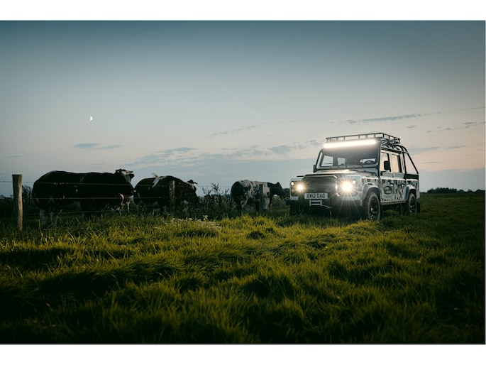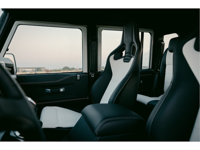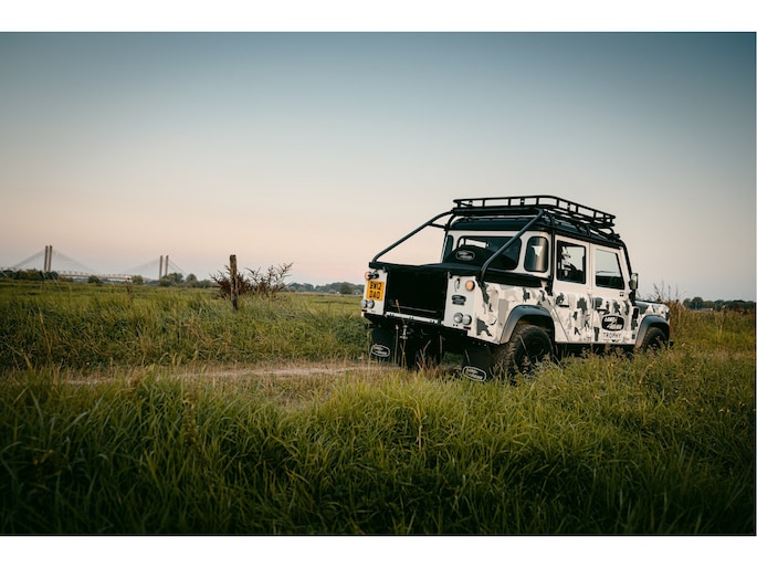 Dit voertuig nam onlangs deel aan een driedaagse ultieme off-road competitie-ervaring in Staffordshire. Afgewerkt in Fuji White met contrasterend Narvik Black dak en glanzende zwarte exterieurelementen, en uitgerust met een 5,0-liter benzine V8-motor en een achttraps ZF automatische transmissie, levert de Defender Works V8 Trophy II 405 pk en 515 Nm koppel. Glanzend zwarte 18-inch Sawtooth lichtmetalen velgen worden aangevuld met verbeterde remmen, een ophangings- en handlingkit voor extra rijvertrouwen. De avontuurlijke camouflage bevat de iconische silhouetten van Defender en Series Land Rovers, verborgen tussen de 23 locaties die een rol hebben gespeeld in Land Rovers illustere avonturen en historische off-road uitdagingen. Accessoires zijn onder meer een multi-point rolkooi en ladder, modderbanden, spotlights, verhoogde luchtinlaat, voertuiglier en bodembescherming; kenmerken om de reis van je leven aan te gaan. De Recaro sportstoelen zijn afgewerkt in hoogwaardig zwart en wit Windsor-leer met contrasterende stiknaden, die steun en comfort combineren. De lederen bekleding strekt zich uit tot het dashboard, de deuren en het hemelbekleding, wat zorgt voor een handgemaakte afwerking door het hele interieur. Een prachtig analoog dashboardklokje, ontworpen en vervaardigd in samenwerking met avonturenhorlogemaker Elliot Brown, is het middelpunt van het dashboard, met een uniek ontwerp dat het camouflagepatroon van het exterieur weerspiegelt.