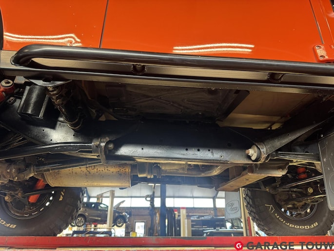 De Defender staat bij geen gebruik altijd binnen in een verwarmde garage, naast een 110, die ook zo mooi is samen gesteld.