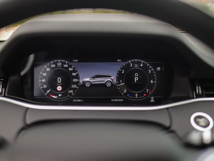 Practical, clear, and extremely handy is the digital dashboard—every function shown in razor-sharp detail. The 360-degree camera on this car is provided by four advanced cameras and guarantees excellent image quality. Your smartphone becomes a sophisticated remote control for this vehicle—Remote Services keep you connected to your car wherever you are. What do you want to listen to en route? There’s plenty of choice thanks to Bluetooth. The full-map navigation system is integrated with the audio system. Automatic climate control is also standard equipment. This Land Rover is fitted with a dashboard with voice control, DAB reception, rain sensor, cruise control, keyless entry, and auto-dimming exterior mirrors.