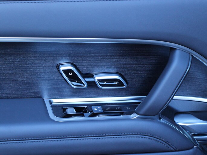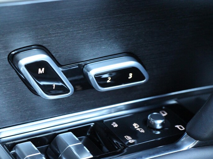 Het interieur is volledig uitgevoerd in Ebony leder, inclusief het met leder beklede hemelbekleding, wat zorgt voor een luxueuze en stijlvolle ambiance. Comfort staat centraal met verwarmbare, verkoelbare én massagestoelen voor, terwijl ook de achterpassagiers genieten van stoelverwarming en koeling achterin. De geïntegreerde koelbox verhoogt het reiscomfort naar first-class niveau.