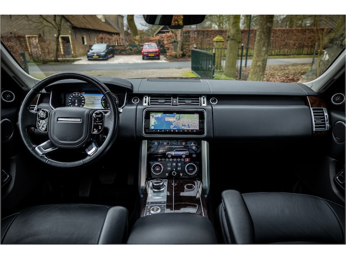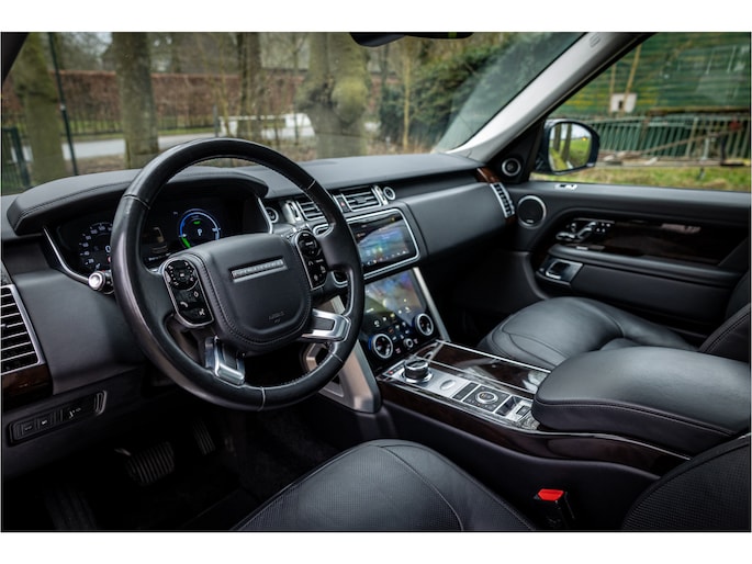 Fraaie Range Rover Vogue met hybride aandrijflijn in complete uitvoering. Lakkleur is Ammonite Grey metallic, het interieur is bekleed met Ebony Black leder wat ook is doorgevoerd op het dashboard.
