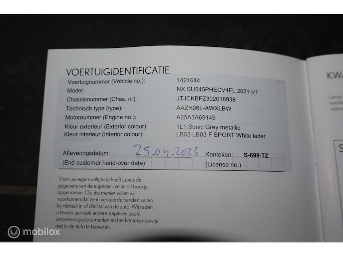 Laat deze prachtige NX450h+ in de gewilde F-Sport uitvoering niet aan u voorbijgaan! Rechtstreeks van de eerste eigenaar met nog 8 jaar fabrieksgarantie tot april 2033. Combineer het nuttige met het aangename in deze plug-in hybrid met hoge instap, een gecombineerd vermogen van liefst 309 pk, en tot 63 kilometer volledig elektrisch rijbereik. Door Lexus Zwolle nieuw in Nederland geleverde auto, hier ook altijd in onderhoud geweest en logische tellerstand 64.863 km. Bij 62.340 km is onderhoud volgens schema uitgevoerd en de apk geldt tot 25 april 2027.