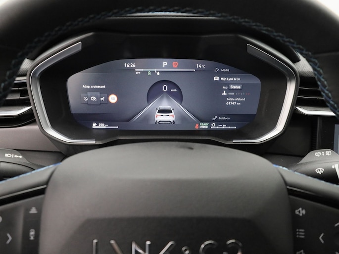 Over het digitale dashboard is goed nagedacht. Alle belangrijke functies binnen en buiten in één oogopslag. De 360 graden camera op deze auto biedt u een volledig, panoramisch zicht op de omgeving. Adaptive cruise control is veilig en comfortabel. De snelheidsregelaar houdt automatisch afstand tot het voertuig dat voor u rijdt. Loopt het verkeer onderweg vast, schakel dan de file assistent in en laat het systeem zorgen voor de juiste afstand bij stilstaan en rijden. U kunt het audio-installatiesysteem met DAB-ontvangst en het full map navigatiesysteem bedienen met de knoppen op het stuur of zelf met uw stem. De Lynk & Co is standaard voorzien van: achteropkomend verkeer waarschuwing, automatische airconditioning, draadloos opladen, regensensor, keyless entry en automatisch dimmende binnenspiegel.