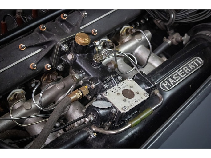 Importantly, this example retains its original Lucas fuel injection system in working order — a rare feature often lost on comparable cars — and remains fully matching numbers, supported by documented correspondence with Maserati and Louwman.