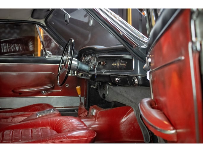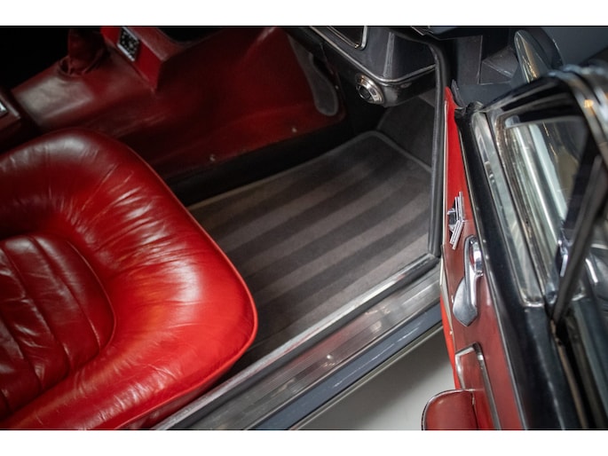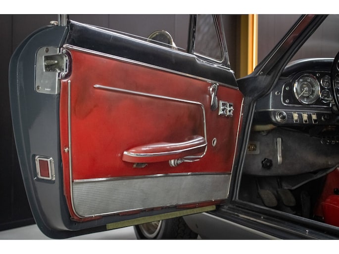 De auto is uitgevoerd in de originele fabriekskleur Grigio Grafite (niet metallic) met een rood lederen interieur — een uiterst zeldzame en zeer gewilde kleurcombinatie die perfect past bij het elegante Italiaanse design uit de jaren ’60. Het interieur verkeert grotendeels nog in originele staat en heeft een prachtige, authentieke patina behouden.