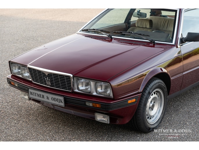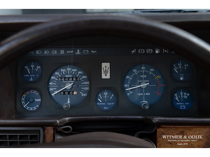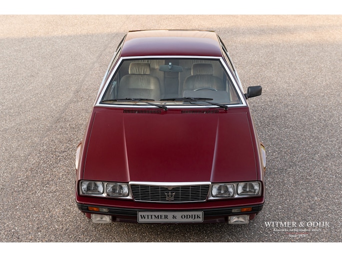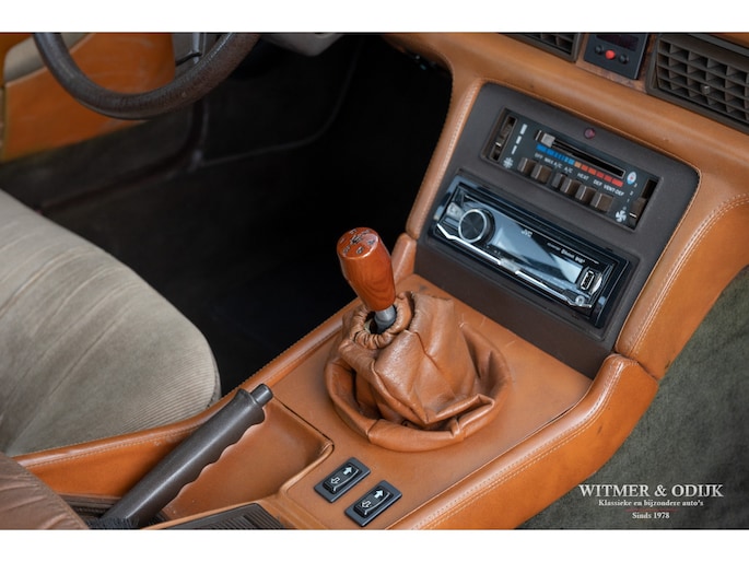In 1976 nam DeTomaso het historische merk Maserati over van Citroën. In een poging om het merk winstgevend te maken werd een 'betaalbare' sportwagen ontwikkeld, de met hulp van Citroën gebouwde Bora en Khamsin waren te kostbaar om een groot publiek te bereiken. Omdat de Italiaanse overheid auto's met een grotere motorinhoud dan 2 liter fors hoger belastte werd een compacte doch sportieve vierzitter ontwikkeld met een voorin geplaatste V6 met 1996cc én twee turbo's. Zo kwam men toch nog aan een niet geringe 180pk en een soepele motorkarakteristiek. In combinatie met een betrouwbare ZF 5-bak met sportschakeling snelt de auto in 6,5 sec. naar 100km/u, en dat met een V6 motorgeluid wat je met een blinddoek om nog herkend als dat van een Biturbo. Een zeer leuke auto met een interieurafwerking uit de edelste materialen, zo is er echt wortelnotenhout en het fijnste Italiaanse leer gebruikt. Zie de foto's van de luxe stoelbekleding bijvoorbeeld. Deze Maserati werd in 2017 naar Nederland gehaald, de laatste eigenaar (een ons bekende ingenieur) kocht de auto bij Wim Prins. Hij liet er het nodige technische werk aan doen, zo is bijvoorbeeld de airco ijskoud en zijn onderhoudszaken als remmen en banden up-to-date. De auto is dan ook rijklaar en voorzien van een recente APK bij ons te koop voor de prijs van een bescheiden boodschappenwagen, staat er toch een Maserati voor uw deur. Zie onze website voor meer dan 80 foto's www.witmerodijk.nl of u gebruikt de volgende link; https://witmerodijk.nl/te-koop/maserati-biturbo-coupe-1984/2176