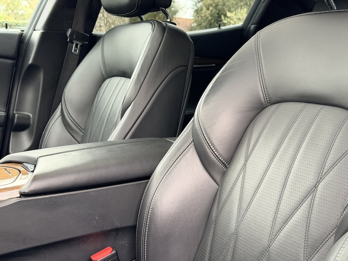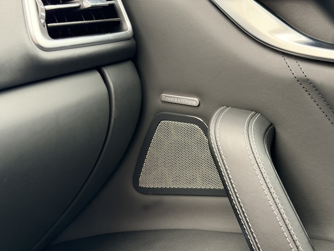 Het interieur is bekleed met geperforeerd fine grain leder, voorzien van stoelverwarming én ventilatie voorin, en zelfs stoelverwarming achterin – een zeldzaamheid in dit segment. Het Bowers & Wilkins audiosysteem zorgt voor een geluidservaring die je normaal gesproken alleen in high-end thuisinstallaties verwacht. Iedere rit krijgt daarmee een extra dimensie.