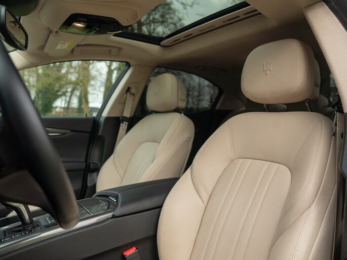 Autoliefhebbers hebben er doorgaans een handje van de boel te romantiseren wanneer ze fantaseren over een droombolide voor alledaags gebruik. Zo ook de voormalig eigenaar van deze prachtig mooie Maserati Ghibli 3.0 V6 met 350 pk aan Bi-Turbo “benzina pura” power. De Italiaanse Tridente werd begin dit jaar op zijn verzoek door ons opgespoord; het exemplaar sprong eruit vanwege zijn fantastische staat en chique specificatie. De geweldige zorg en aandacht die uitging naar de zoektocht bleek een voorbode op de omgang en het onderhoud van de Ghibli V6 tijdens gebruik. Uiteindelijk ging dit de eigenaar in de weg zitten; hij was simpelweg té zuinig op zijn Maserati om er dagelijks mee de weg op te sturen. Om te voorkomen dat het een lijdensweg werd, besloot hij zijn droomauto opnieuw bij ons aan te bieden, en er een andere liefhebber mee blij te maken. Immers, blij wordt u natuurlijk sowieso van dit stijlicoon in 4-deurs configuratie: het elegante Nero Assoluto lakwerk gecombineerd met licht Sabbia leder maken de luxe sportsedan smaakvoller dan smaakvol. Het uitrustingsniveau kan dan uiteraard niet achterblijven en omvat onder andere een Premium Pack, Business Pack Plus en stoelverwarming. Wie gaat de Ghibli 3.0 V6 met fluwelen handschoenen aanpakken en durft het desondanks aan om deze zwarte parel binnen 5,5 seconden van 0 naar 100 km/h te laten accelereren?