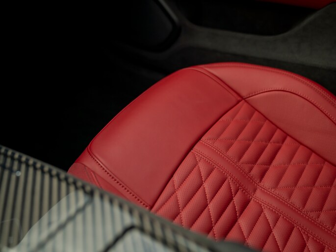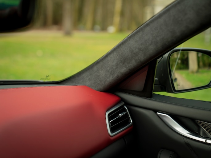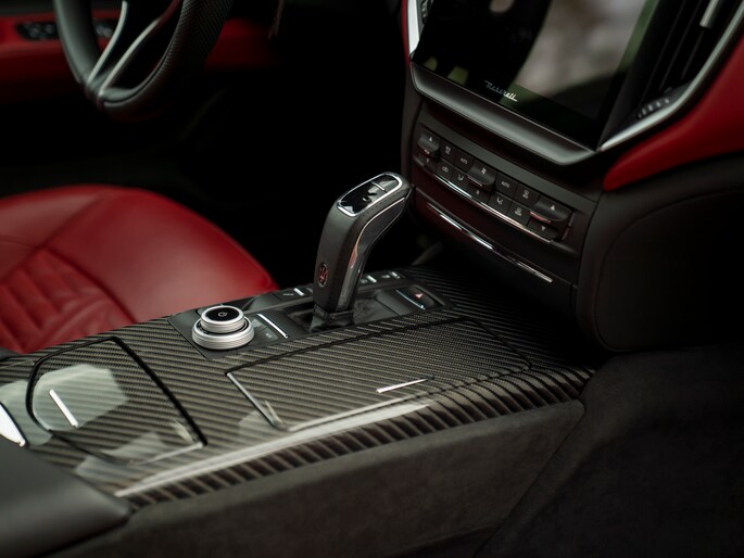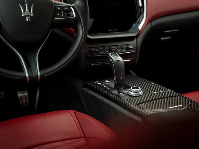 Wonderschoon van buiten, wonderschoon van binnen. De Ghibli V8 Trofeo cockpit wordt gekenmerkt door hoogwaardig materiaalgebruik en oog voor échte klasse. Rosso leder heeft de overhand en is toegepast op onder andere het dashboard, de stoelen en portieren. Trofeo badges in de hoofdsteunen en alcantara door het hele interieur, op zowel de stijlen als de dakhemel en lage delen van het interieur (een unieke Atelier optie die speciaal op wens van onze klant gerealiseerd is) benadrukken de exclusiviteit van onze Maserati, terwijl een Interior Carbon Pack de sportieve ziel van de V8-aangedreven bella berlina maximaal onderstrepen. Onder andere de midden-/tunnelconsole en portierlijsten zijn voorzien van een schitterende koolstofvezel touch. Contraststiksels en een elektrisch glazen schuif-/kanteldak zorgen op subtiele, maar o zo effectieve wijze voor licht in de overwegende duistere cockpit.