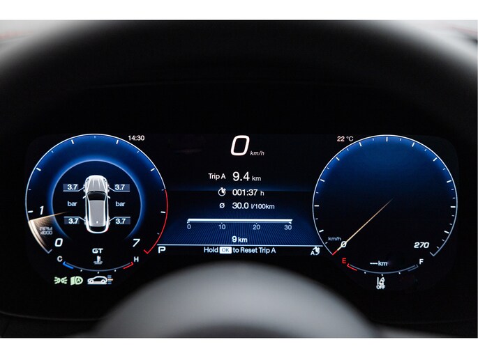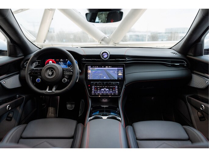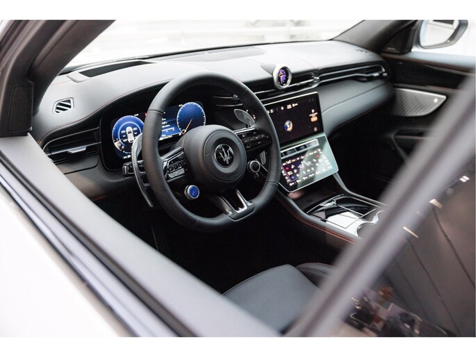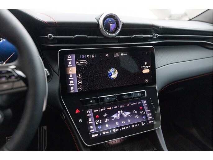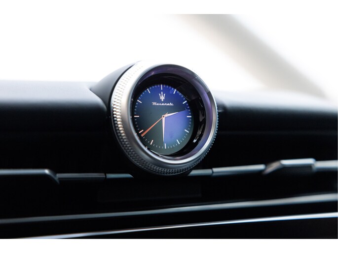 De klassieke analoge klokken achter het stuurwiel hebben plaatsgemaakt voor een modern 12.3’’ digitaal scherm. Daarnaast is deze Grecale uitgerust met een Head-up display. In het middenconsole worden twee digitale schermen 12.3’’ en 8.8’’ gescheiden door een digitale versnellingspook. Het 12.3’’ scherm voor zaken als; navigatie, media, rijstanden, voertuiginstellingen en draadloos Apple Carplay en Android Auto. De verlichting, stoelen, klimaatregeling, klok en andere instellingen worden bediend op het 8,8” Comfort-display. De iconische mechanische klok is een digitale smartwatch geworden, die u kunt aanpassen naar uw eigen stijl. Het geeft niet alleen de tijd weer, maar wordt ook een interface tussen bestuurder en auto waarmee slimme vocale interacties mogelijk zijn.