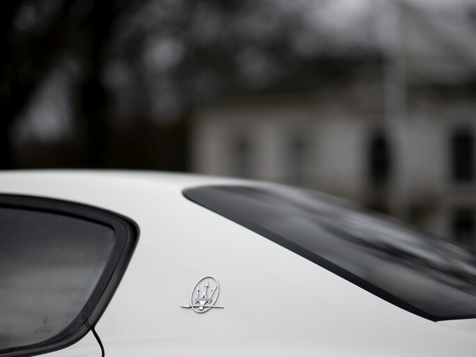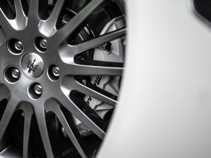 Over de velgen gesproken: deze Trident Dark Chrome exemplaren halen het mooiste in het tijdloze design van de Quattroporte naar boven. Ze zijn sportief en zwierig tegelijk. Om van te watertanden! In het bijzonder in combinatie met de Bianco Eldorado exterieurlak. Het contrast met de velgen is weergaloos, de lak prachtig egaal wit. Maar niet spierwit. Eigenlijk precies goed!