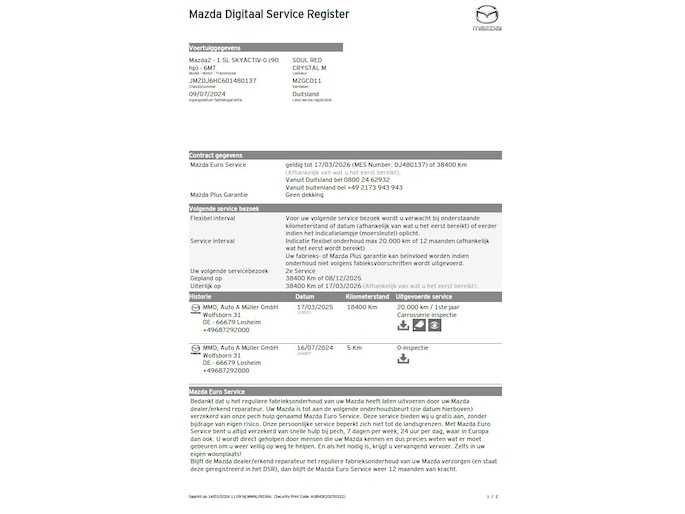 De laatste onderhoudsbeurt heeft deze Mazda 2 gehad op 17-03-2025 bij 18.400 km.