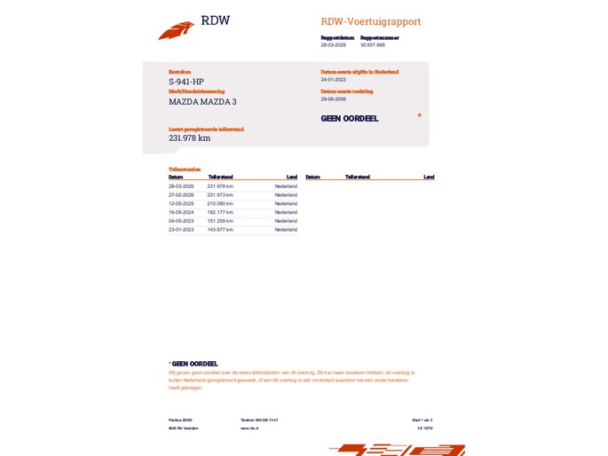 De 3 heeft een topsnelheid van 185 km per uur en bereikt vanuit stilstand de 100 km/u in 11 seconden. Het verbruik van deze personenauto is gemiddeld 7,2 liter per 100 km en hij weegt 1140 kg. De APK is geldig tot 30-06-2026 en de wegenbelasting bedraagt gemiddeld € 149,- per kwartaal.