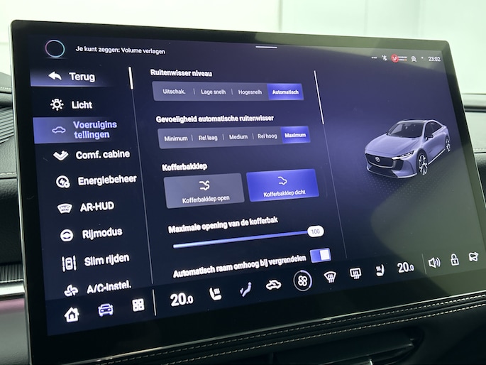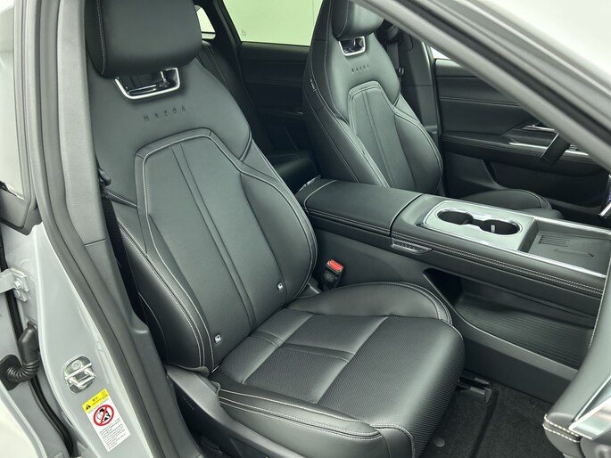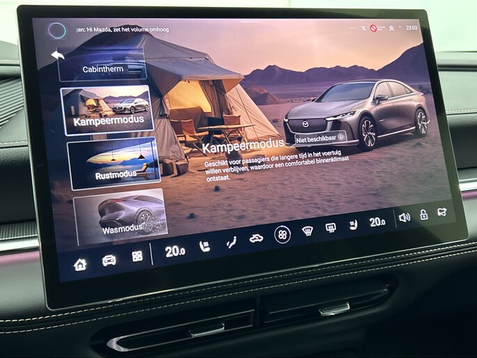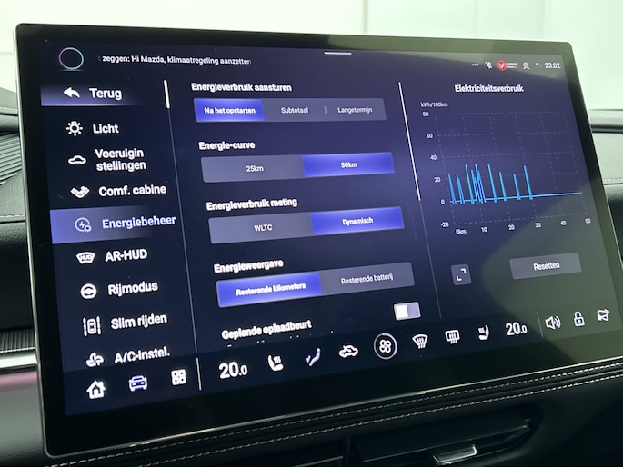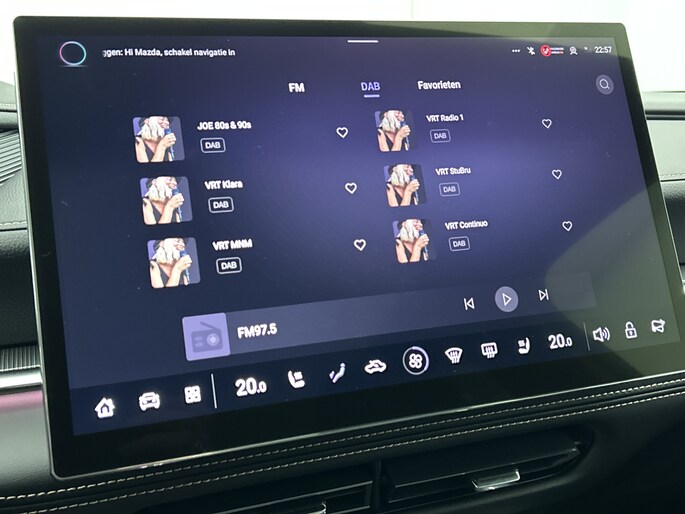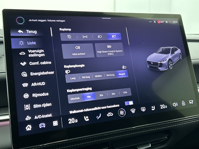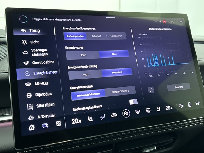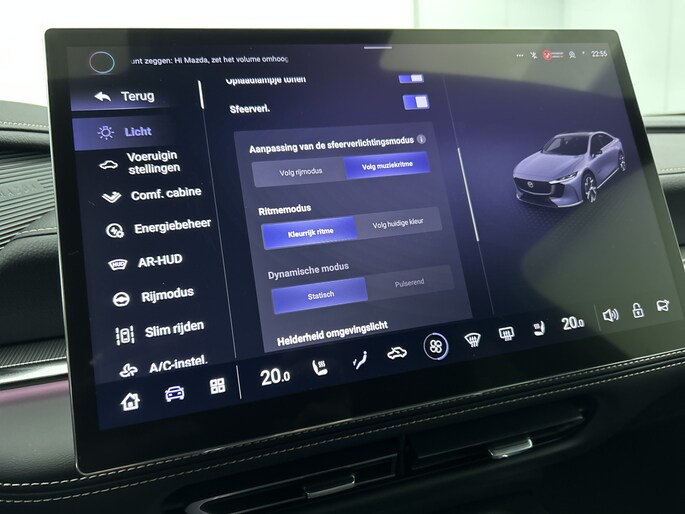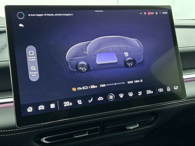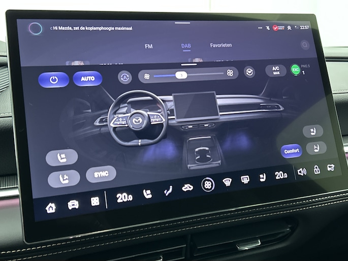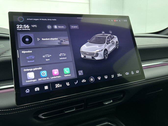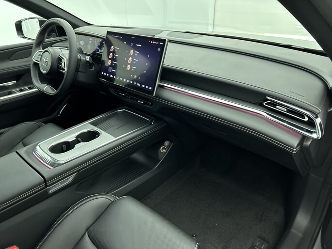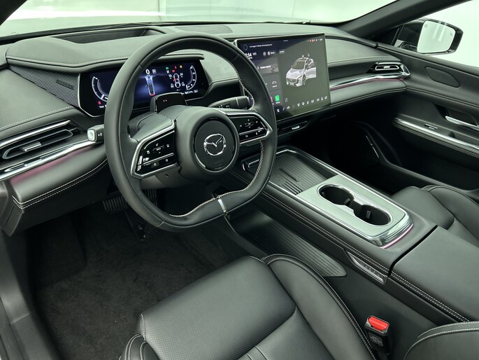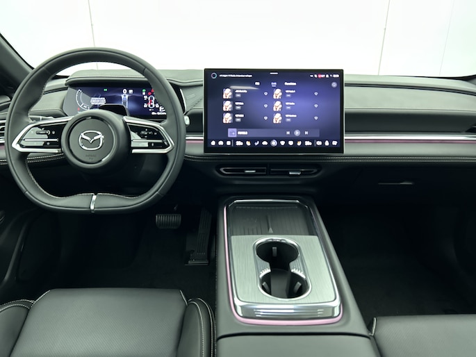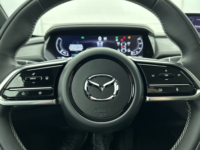 Het systeem controleert alle belangrijke functies en geeft die perfect weer via het digitale dashboard. De 360 graden camera op deze auto biedt jou een volledig, panoramisch zicht op de omgeving. Adaptive cruise control houdt de ingestelde snelheid vast en houdt afstand tot het voertuig voor je. Rijden-stilstaan, rijden-stilstaan. Niks is irritanter en vermoeiender dan filerijden. Daar heeft deze Mazda 6e een oplossing voor: de file assistent, die met radarmeting permanent het tempo aanpast op de voorligger. Zelfs als die stopt. Het audio-installatiesysteem is gecombineerd met het navigatiesysteem en geeft je de keus om onderweg te luisteren wat je wilt. Verkeersinfo, je favoriete albums en radioprogramma's, podcasts, luisterboeken... zeg het maar. Deze auto heeft ook bluetooth aan boord. Naast de routeinformatie van het gekoppelde navigatiesysteem kan je muziek via het audio-installatiesysteem ook online beluisteren dankzij bluetooth. Natuurlijk behoren dashboard met spraakbediening, electronic climate control, draadloos opladen, DAB ontvangst, keyless entry en automatisch dimmende binnenspiegel ook tot de uitrusting van deze complete auto.