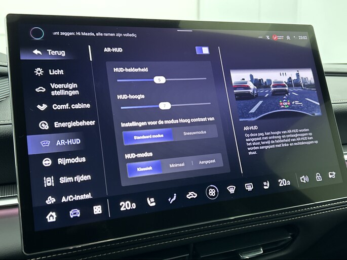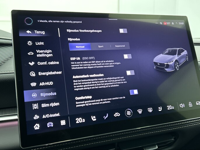 Deze Mazda is voorzien van verschillende intelligente veiligheidsvoorzieningen. Ze kijken tijdens het rijden als het ware met je mee, ze signaleren potentieel gevaarlijke situaties en in een aantal gevallen kunnen ze ook ingrijpen. Hou de weg in het vizier! De head-up display zorgt dat je de dashboardinfo in je beeld geprojecteerd krijgt. Een belangrijke bijdrage aan de veiligheid onderweg levert de verkeersbord-detectie. Het Lane-keeping systeem zorgt voor een automatisch constante positie binnen de rijstrook. Afdwalen is uitgesloten. Verder is deze auto uitgerust met dodehoekdetector detectiesysteem, forward collision warning system, hill hold functie en autonoom remsysteem.