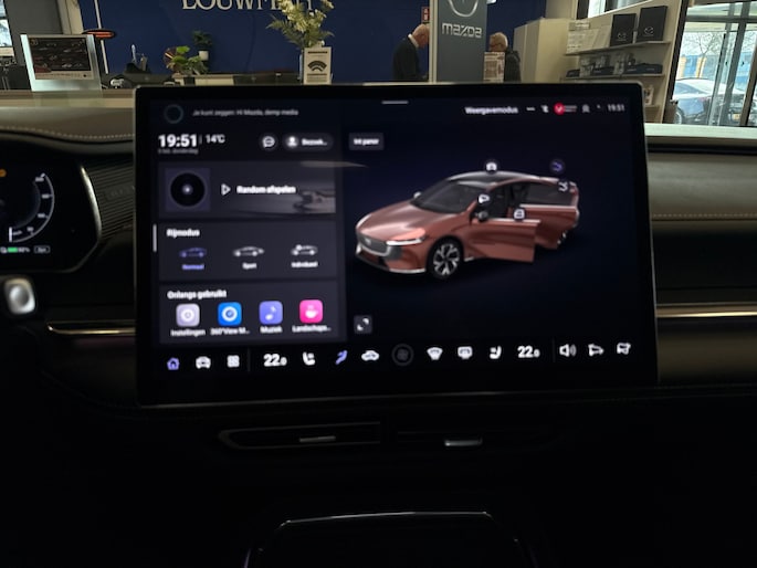 Het digitale dashboard vertelt je alles wat je wilt weten voor een slimme, comfortabele en veilige rit. De functie van de 360 graden camera in deze auto is om jou een totaaloverzicht van de omgeving te geven, ongeacht hoe smal de straat of parkeerplek is. Adaptive cruise control is een comfortabele en veilige optie. Het systeem reguleert de snelheid en houdt automatisch afstand tot jouw voorligger. Na een lange werkdag in de file: daar zit niemand op te wachten. Gelukkig helpt de file assistent een handje. Het radarsysteem meet de ruimte tot de voorligger en bewaakt de juiste afstand. Stilstaan? Dan remt en stopt de auto vanzelf. Spraakbediening verhoogt de veiligheid en het gebruiksgemak. De auto luistert naar jouw instructies en volgt ze op. Deze Mazda is voorzien van navigatiesysteem, electronic climate control, draadloos opladen, DAB ontvangst, keyless entry en automatisch dimmende binnenspiegel.
