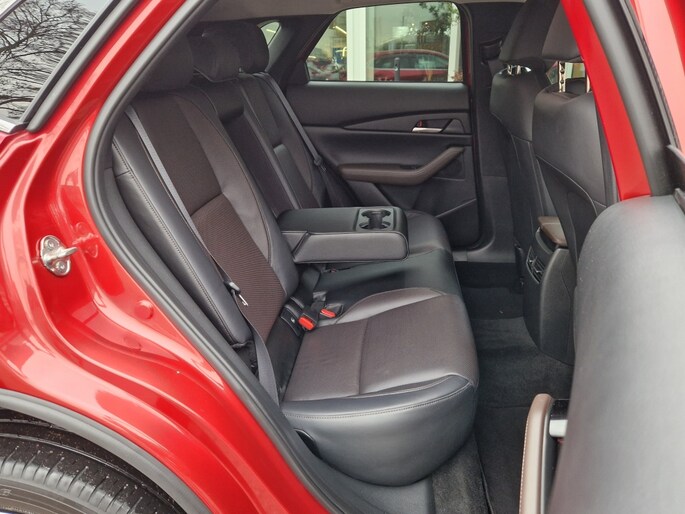 Het interieur van de Mazda CX-30 2.0 Luxury straalt elegantie uit, mede dankzij de lederen versnellingspook. Dit hoogwaardige materiaal voegt een vleugje luxe toe aan het interieur en zorgt voor een comfortabele rijervaring. Bovendien is de achterbank in delen neerklapbaar, waardoor u eenvoudig extra bagageruimte kunt creëren wanneer dat nodig is.