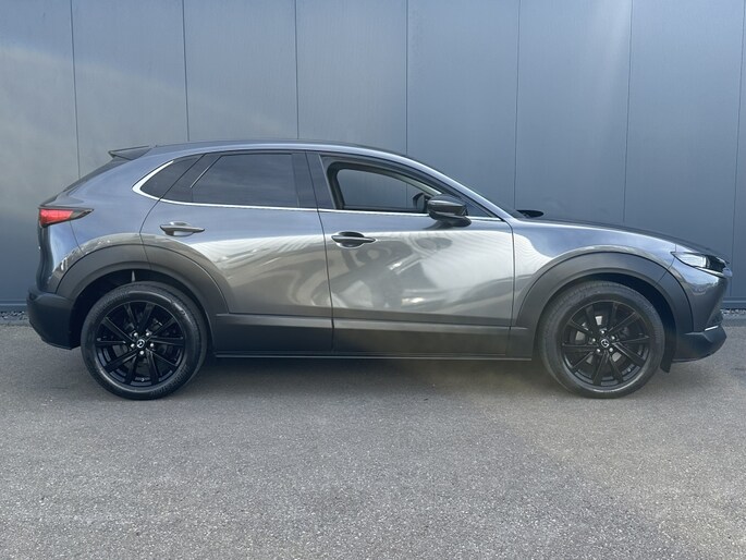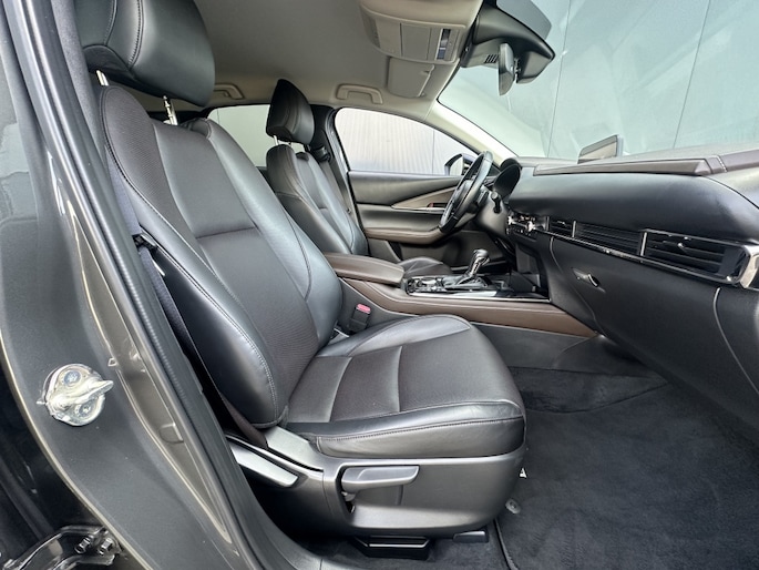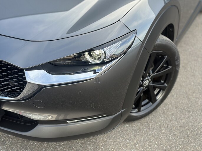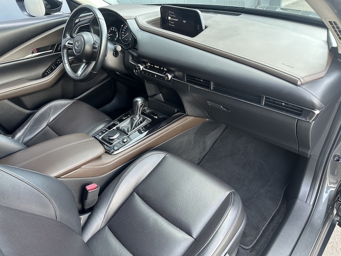 De machine grey metallic lak van de Mazda CX-30 zorgt voor een luxe uitstraling en beschermt de auto tegen weersinvloeden. De vijf deuren bieden gemakkelijke toegang tot de ruime en comfortabele cabine, waar u en uw passagiers kunnen genieten van een aangename rit, ongeacht de bestemming.