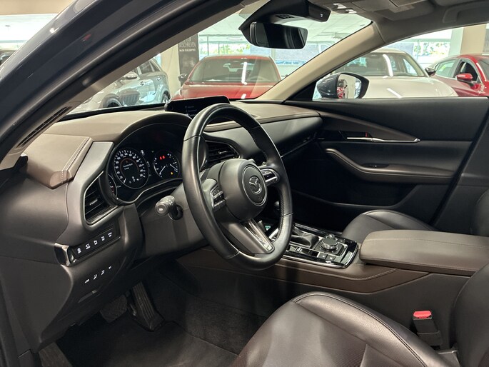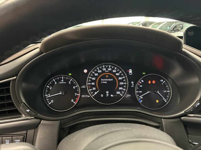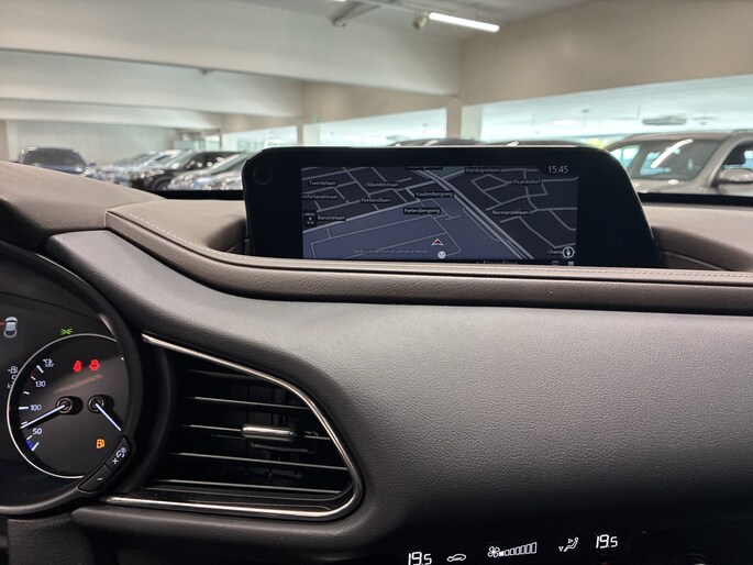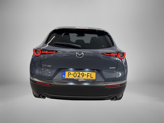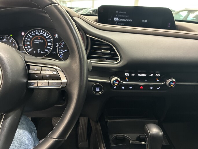 Laat je niets wijsmaken, deze Mazda CX-30 biedt alles wat jij van een auto verlangt. Deze auto komt uit 2022. De auto heeft een opmerkelijk lage kilometerstand van slechts 35130 Twijfel je nog tussen rijden op benzine of elektrisch? Niet nodig. Deze hybride Mazda CX-30 doet het allebei. Als we het over extra cachet hebben, moeten we zeker het lederen interieur noemen. Een weldaad voor jou en je bijrijder: deze Mazda CX-30 heeft verwarmbare voorstoelen. Dat noemen ze nou een ruimtelijk effect: het elektrisch bediende glazen panoramadak. De achterklep opent automatisch met een druk op de knop. Handig als je met volle handen staat. Bij de zeer complete uitrusting van deze auto behoren ook 18 inch lichtmetalen velgen, LED koplampen, dakspoiler, donker getint glas achter, in delen neerklapbare achterbank en LED-achterlichten.