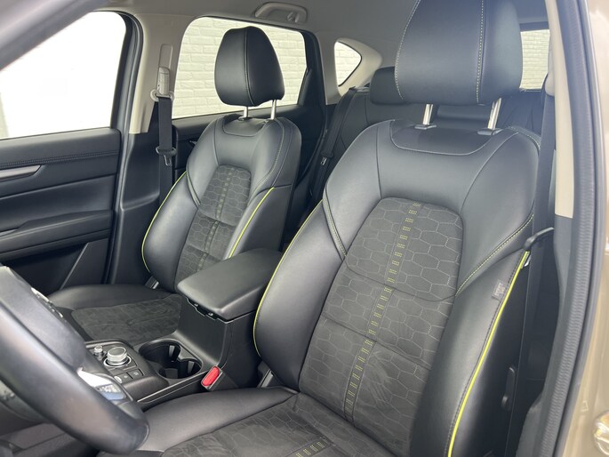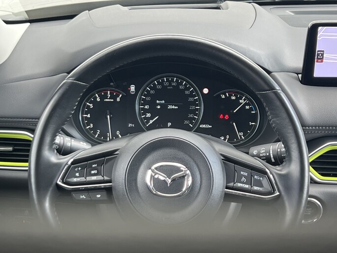 De slimme lay-out van het digitale dashboard zorgt voor een uitstekend overzicht onderweg. Het gebruik van de 360 graden camera op deze auto vergemakkelijkt het parkeren aanzienlijk, vooral in krappe ruimtes. Deze Mazda CX-5 is voorzien van remote services. Via uw smartphone bedient u diverse functies ook op afstand en krijgt u informatie over de status van uw auto. Onderweg kunt u veilig genieten van het audiosysteem met DAB-radio en het full map navigatiesysteem. Want in deze Mazda bedient u ze vanaf het stuurwiel of met uw stem. Onderweg laadt u uw smartphone snoerloos op met behulp van de draadloze oplaadmogelijkheid voor telefoons. Deze auto is voorzien van achteropkomend verkeer waarschuwing, electronic climate control, regensensor, cruise control, keyless entry en automatisch dimmende binnenspiegel.