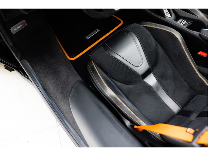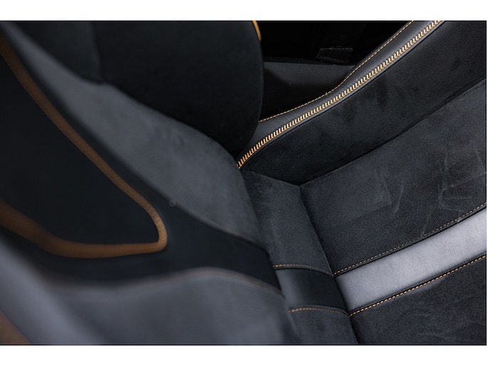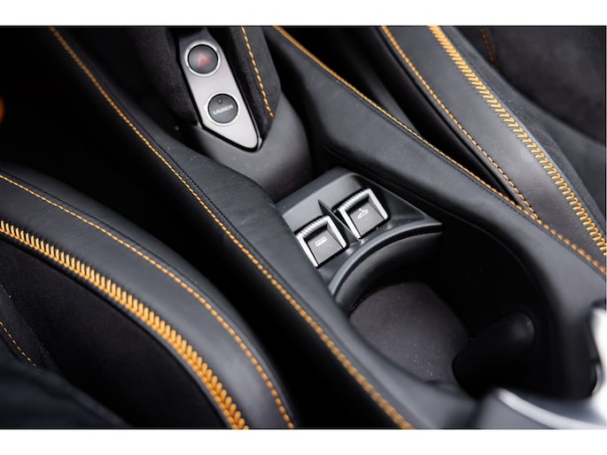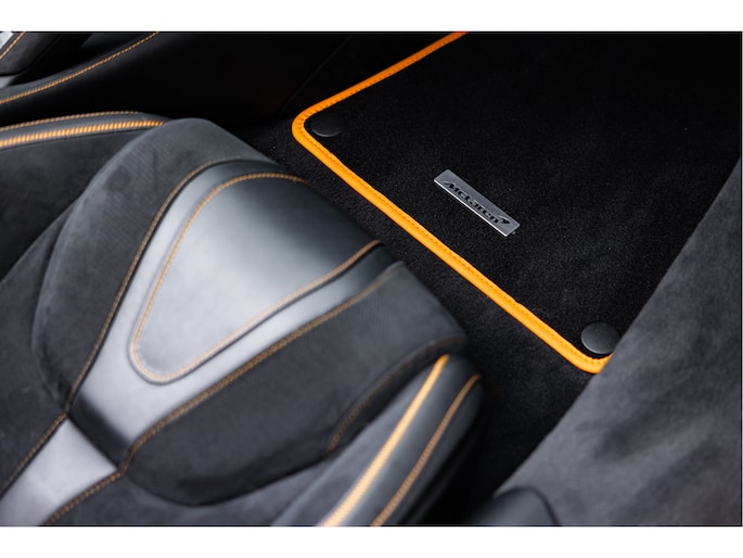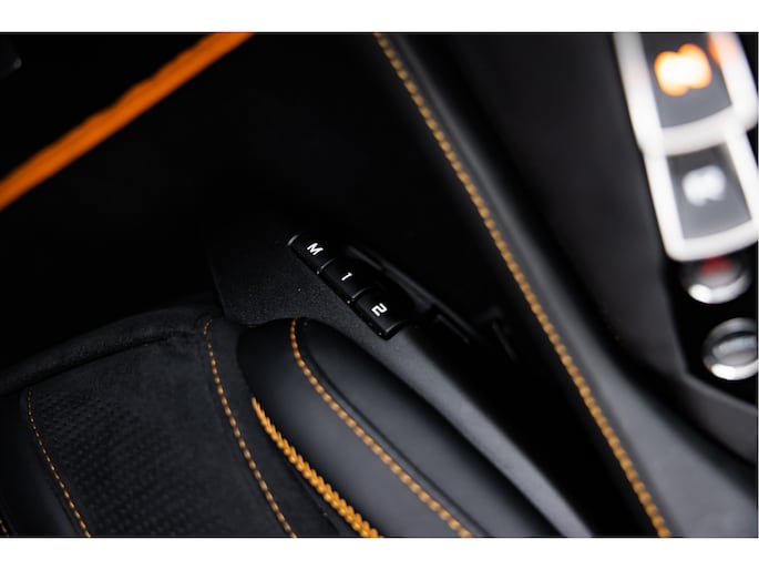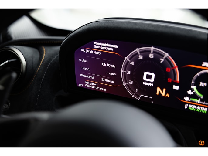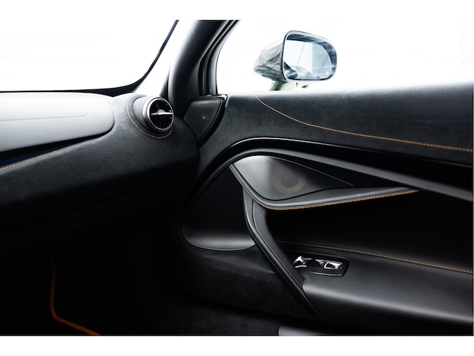 De auto is uitgerust met het standaard Performance carbon fiber Interior Pack 1 tevens interieur hebben we een zwart leder / alcantara combinatie afgewerkt met een McLaren Orange contractstiksel wat ook weer op de remcalipers terug komt. Daarbij Carbon Interior Pack 1 met het stuurwiel, raambedieningsomlijst en active panel ( allen Pack 1) in carbon inclusief de extend shift paddles.