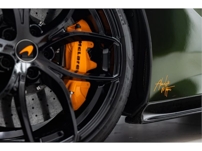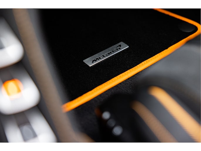 Diverse accenten zijn in het McLaren Orange uitgevoerd zoals de logo's op de auto en de centrecaps van de velgen.