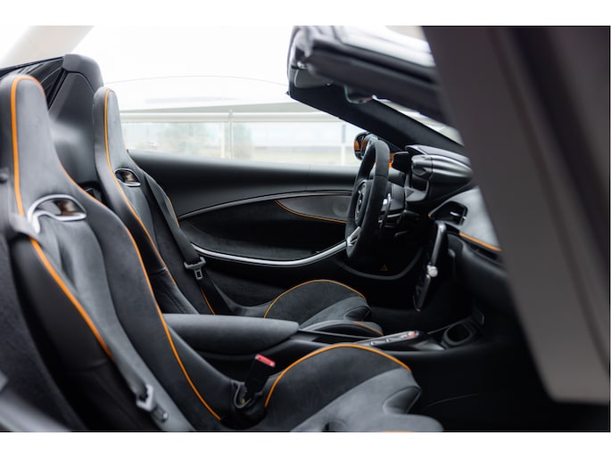 Het zwart lederen/alcantara interieur is afgewerkt met een Vision Orange bies.