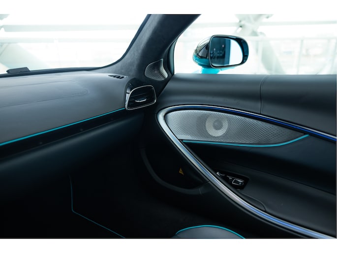 Het zwart lederen interieur is afgewerkt met een mathcing blauwe bies.