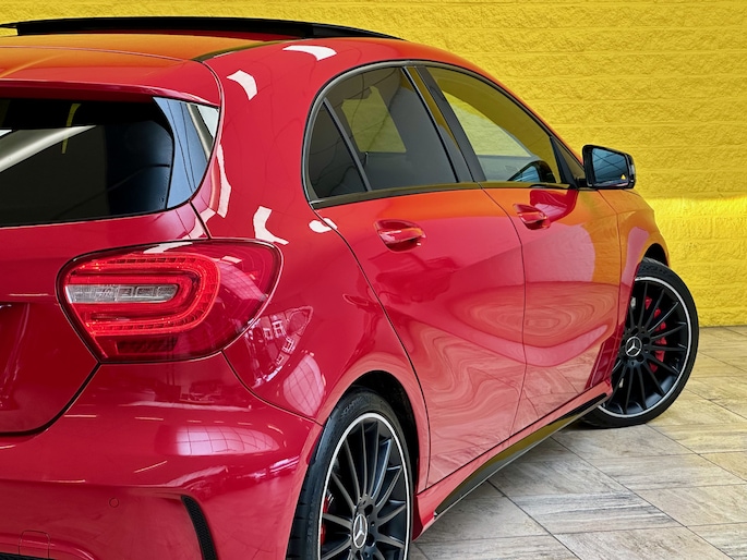 Deze Mercedes A45 AMG is een waar bommetje op wielen. Een opvallende verschijning dankzij de rode lak, het agressieve uiterlijk en natuurlijk het vermogen dat het stoere design volledig waarmaakt.
