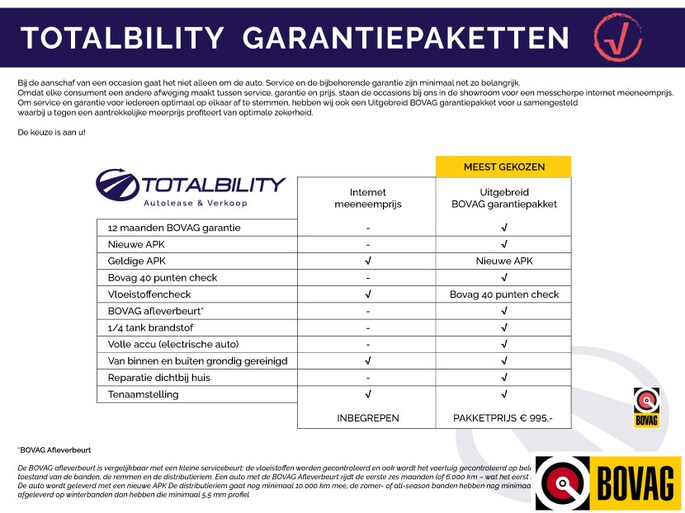 De internet meeneemprijs is inclusief 12 maanden wettelijke garantie, geldige APK, van binnen en buiten grondig gereinigd, tenaamstelling en een vloeistoffencheck. Optioneel biedt Totalbility een uitgebreid BOVAG pakket aan met de volgende aanvullingen t.o.v het standaard pakket: + 12 maanden BOVAG garantie, + BOVAG 40 punten check, + BOVAG afleverbeurt, + reparatie van je auto dichtbij huis, + 1/4 tank brandstof of volle accu (electrische auto), + nieuwe APK. (uitgezonderd youngtimers en oldtimers)