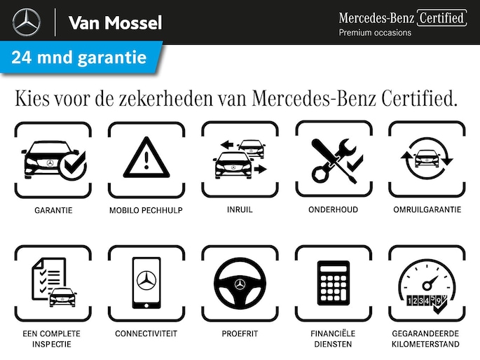 Dit afleverpakket bevat (in plaats van afleverpakket "Basis Garantie"): Mercedes-Benz Certified (24 maanden); Banden met een minimaal profiel van 4 mm, Binnen & buitenzijde gepoetst, De eerste 6 maanden of 10.000 km geen aanvullende kosten*, Onderhoudsbeurt*, Vloeistoffencheck, Volle tank brandstof