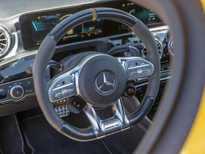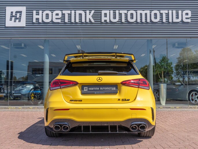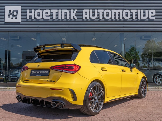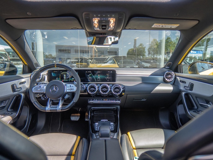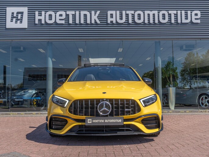 Mooie Mercedes A45 S uitgevoerd in het opvallende ‘Sunyellow’. Een zeer sportieve en complete configuratie met de belangrijkste opties zoals: schaalstoelen, panoramadak, head-up display, Multibeam LED koplampen, sportuitlaat en Burmester sound system.