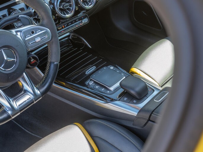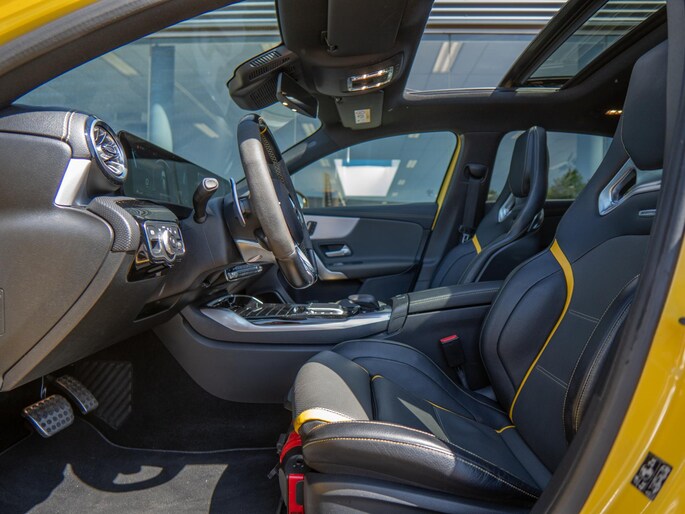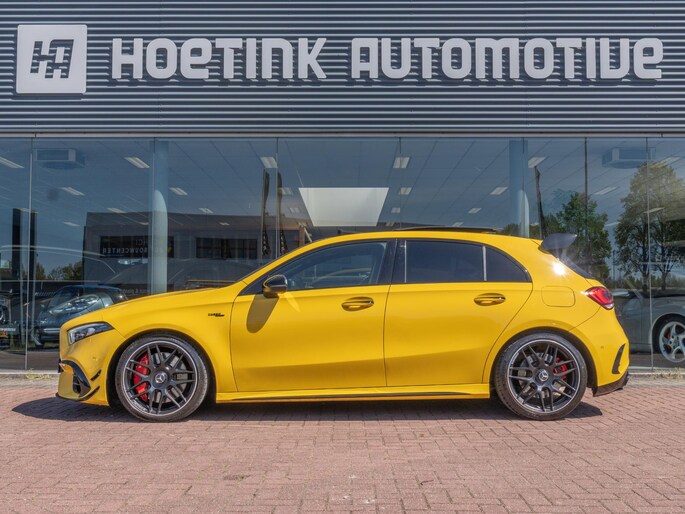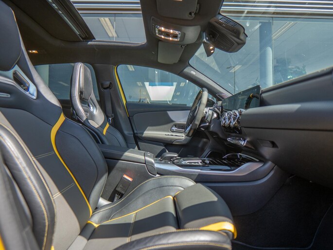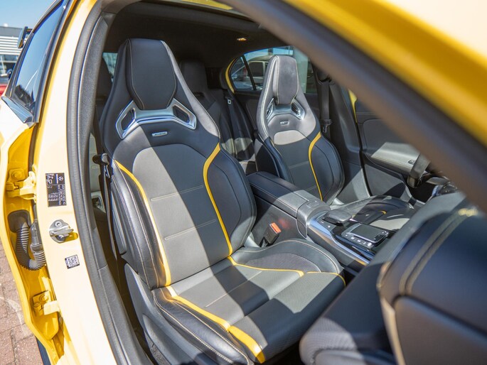 Beautiful Mercedes A45 S finished in the striking ‘Sunyellow’. A very sporty and complete configuration with the most important options such as: bucket seats, panoramic roof, head-up display, Multibeam LED headlights, sports exhaust and Burmester sound system.