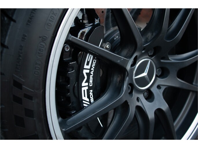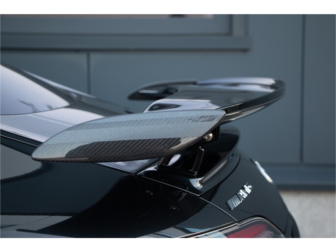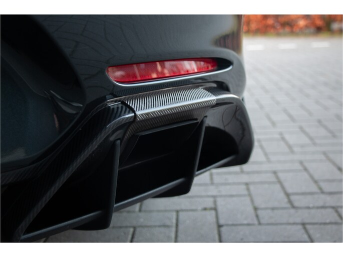 Het exterieur van deze Mercedes-AMG GT R Pro wordt gekenmerkt door de uitgebreide AMG Carbon exterieurpakketten, waarbij splitter, diffuser, aerodynamische elementen en details in zichtbaar carbon zijn uitgevoerd. Dit zorgt niet alleen voor een agressieve en onderscheidende uitstraling, maar draagt ook bij aan een verbeterde aerodynamica en gewichtsbesparing. De auto staat op indrukwekkende AMG Performance gesmede velgen (19 inch voor, 20 inch achter), afgewerkt in matzwart met een glansgedraaide rand, wat het racekarakter verder benadrukt. Achter deze velgen bevindt zich het hoogwaardige AMG keramische remsysteem, ontworpen om zelfs onder extreme circuitbelasting consistente en fade-vrije remprestaties te leveren.