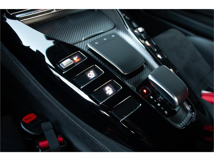 Binnenin zet de Mercedes-AMG GT R Pro deze motorsportfilosofie naadloos voort. Het interieur is uitgevoerd met Exklusiv Nappa leder en Dinamica, gecombineerd met gele contraststiksels, wat perfect aansluit bij het high-performance karakter van het model. Mat carbon interieurdecor en de uitgebreide Exklusiv afwerking zorgen voor een luxueuze, maar functionele cockpit waarin de bestuurder centraal staat. De designo zwarte hemelbekleding, carbon instaplijsten en gekleurde veiligheidsgordels maken duidelijk dat elk detail met uiterste precisie is gekozen.