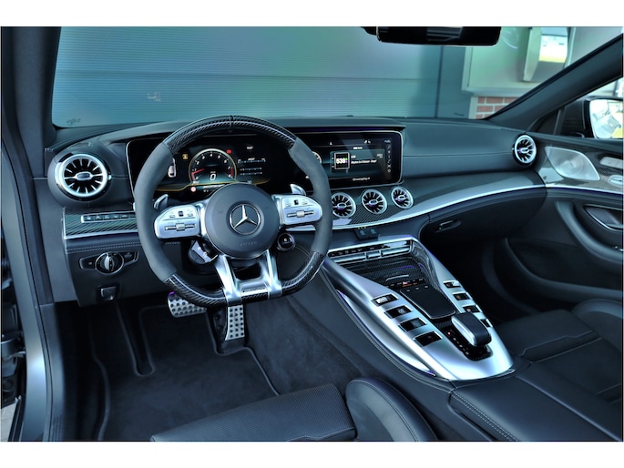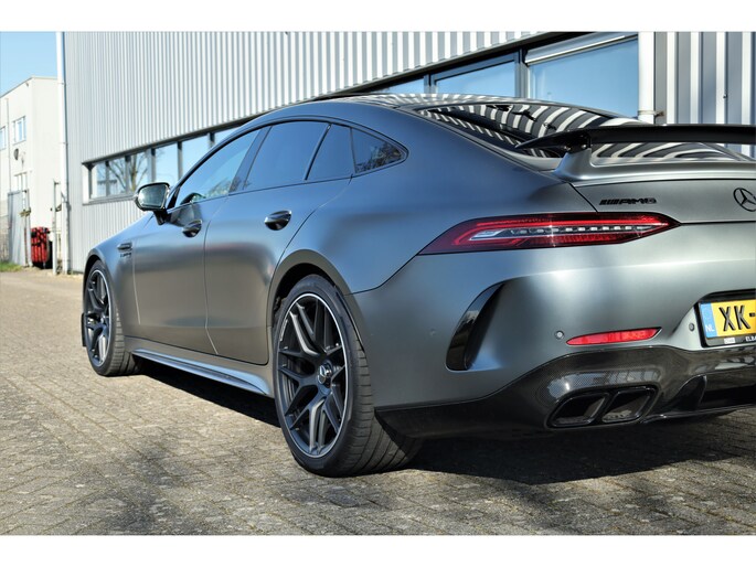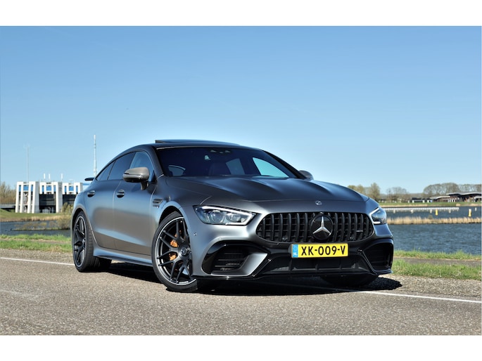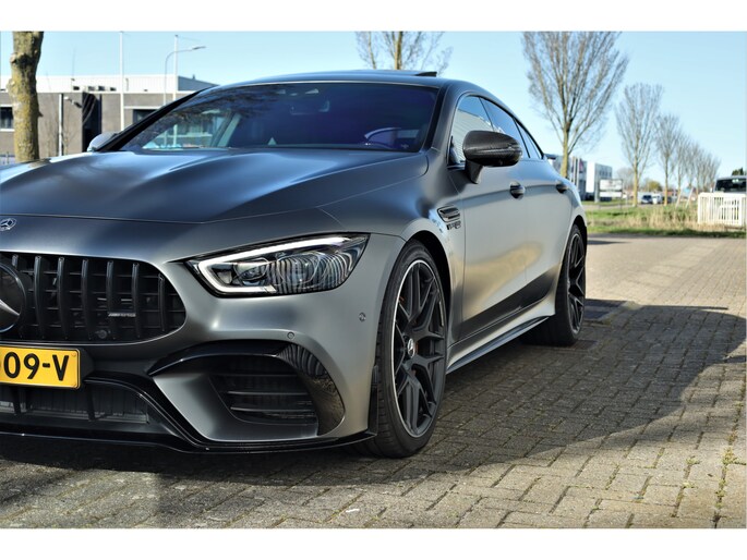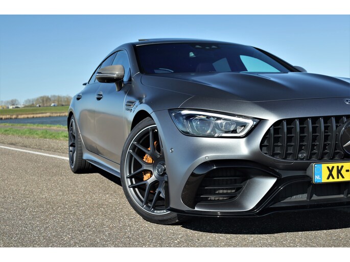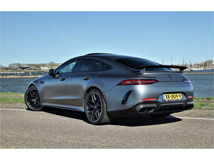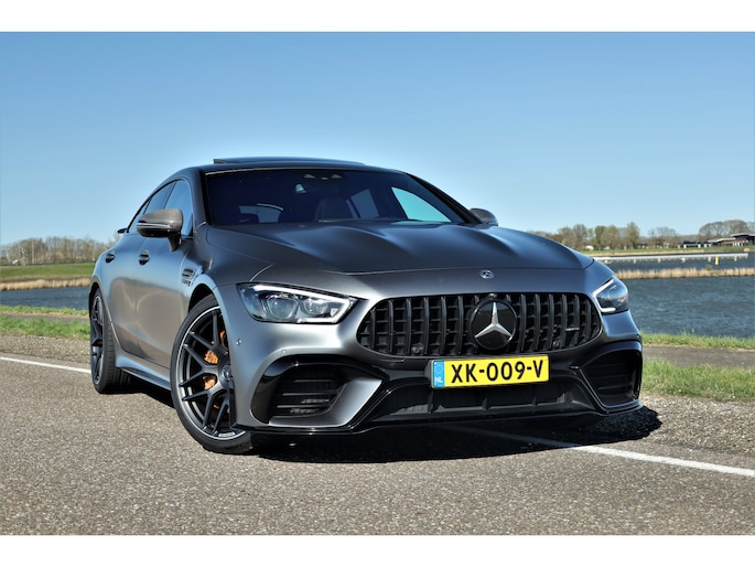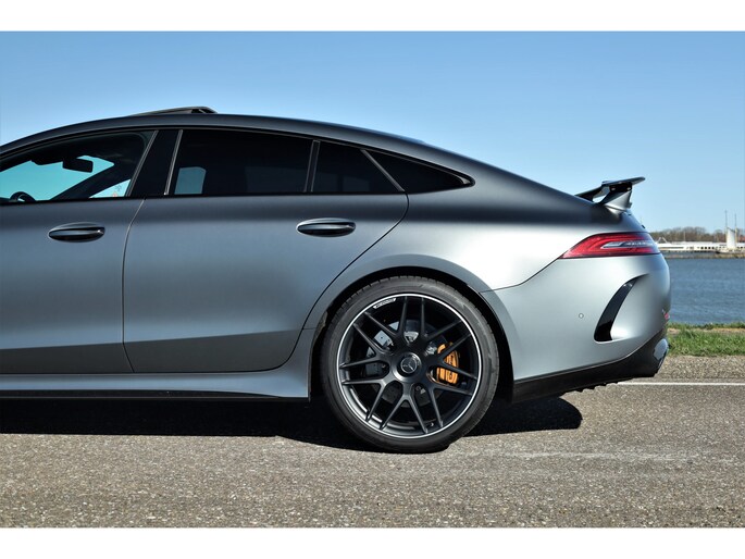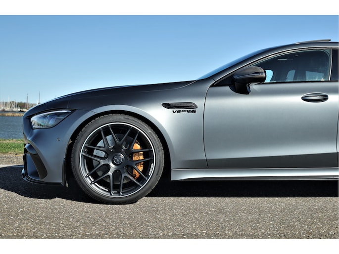 Retesnelle en bomvolle Mercedes AMG GT 63 S 4MATIC+ Premium Plus, uitgevoerd in seleniet grijs magno met een zwart leder exclusief interieur; een schitterende combinatie.