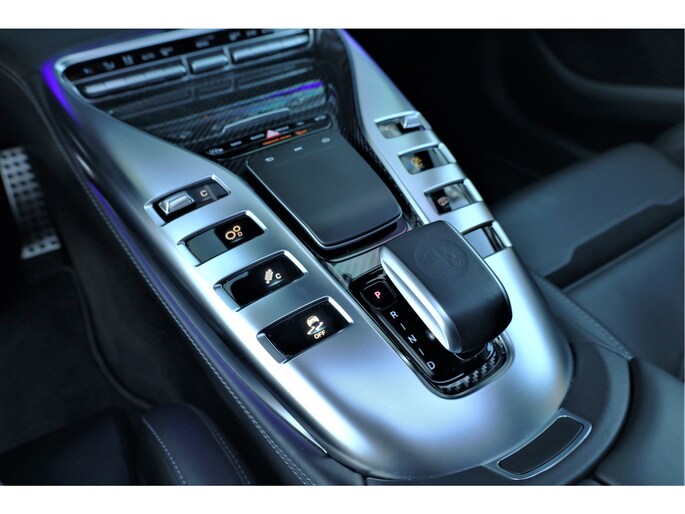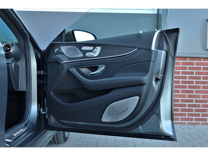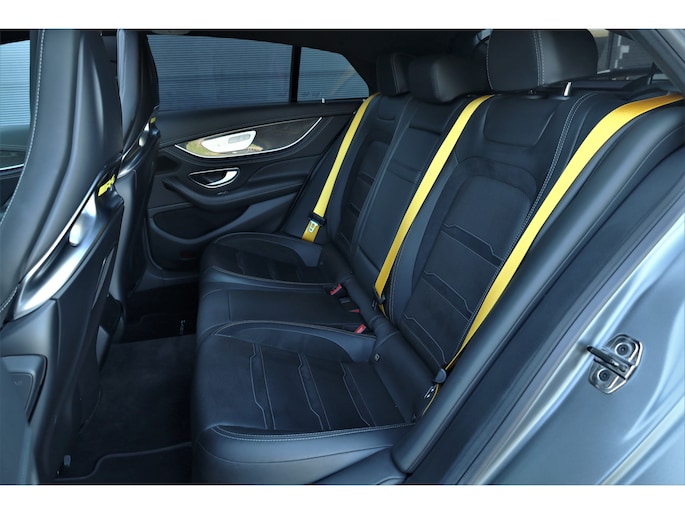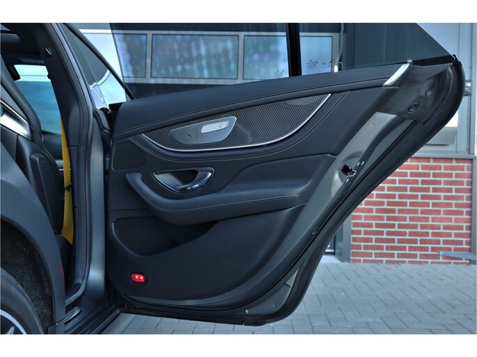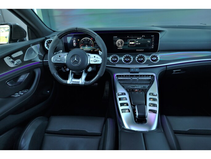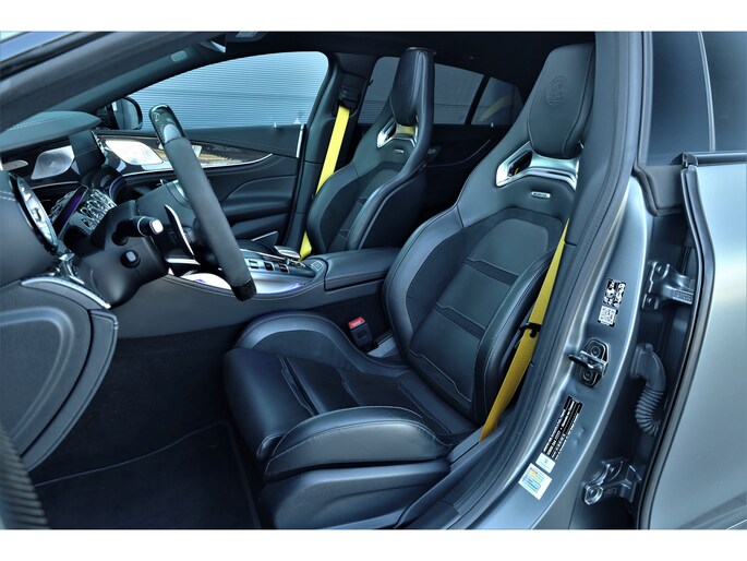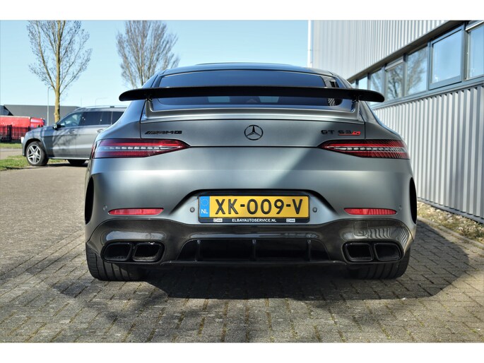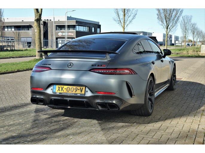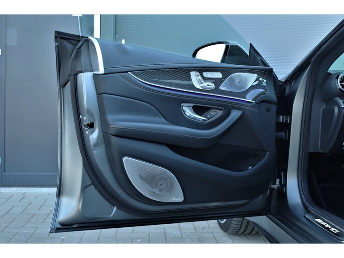 Retesnelle en bomvolle Mercedes AMG GT 63 S 4MATIC+ Premium Plus, uitgevoerd in seleniet grijs magno met een zwart leder exclusief interieur; een schitterende combinatie.