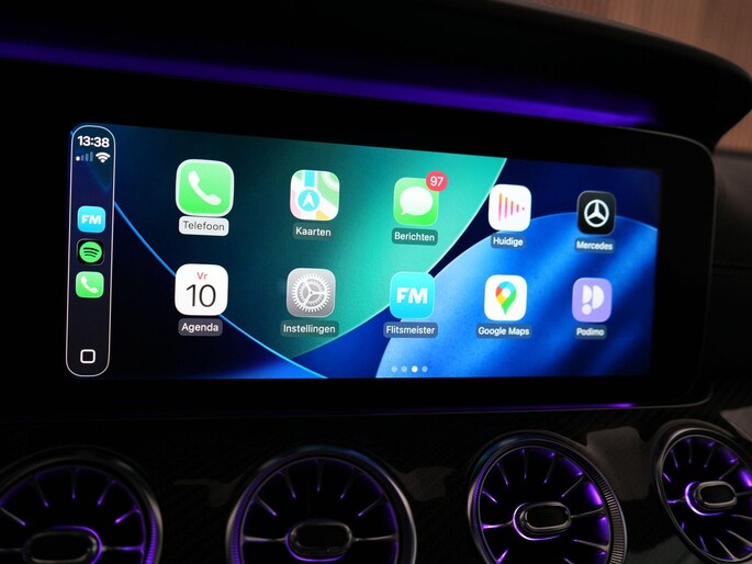 Buiten laat hij direct zien dat het menens is: AMG carbon exterieurpakket, carbon buitenspiegels, statische carbon achterspoiler, hoogglans Shadow Line, 21 inch AMG dubbelspaaks velgen en donker getint glas.