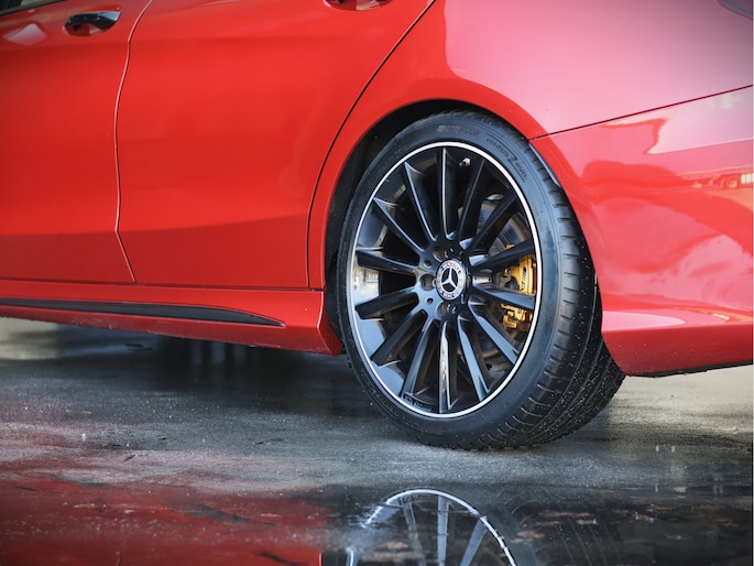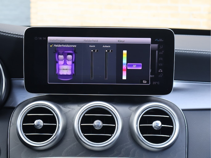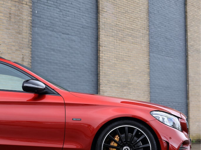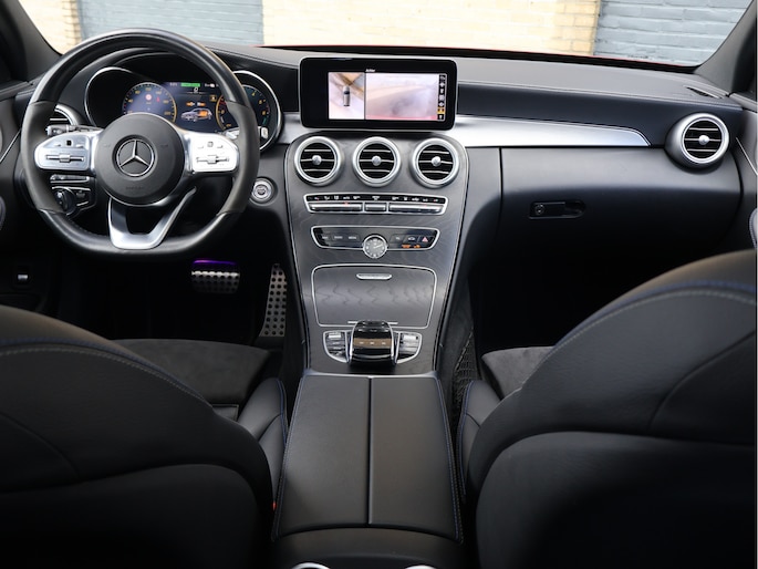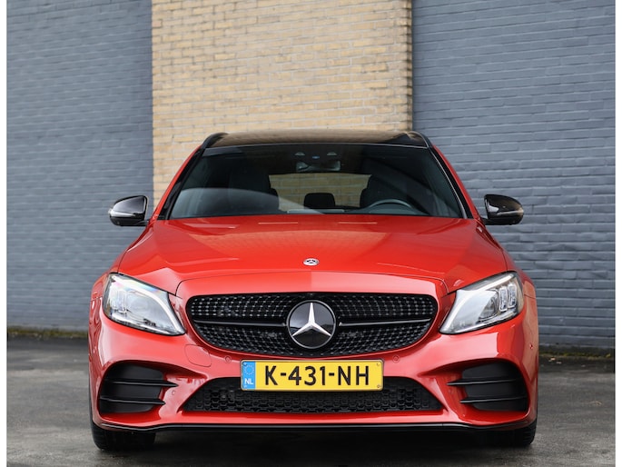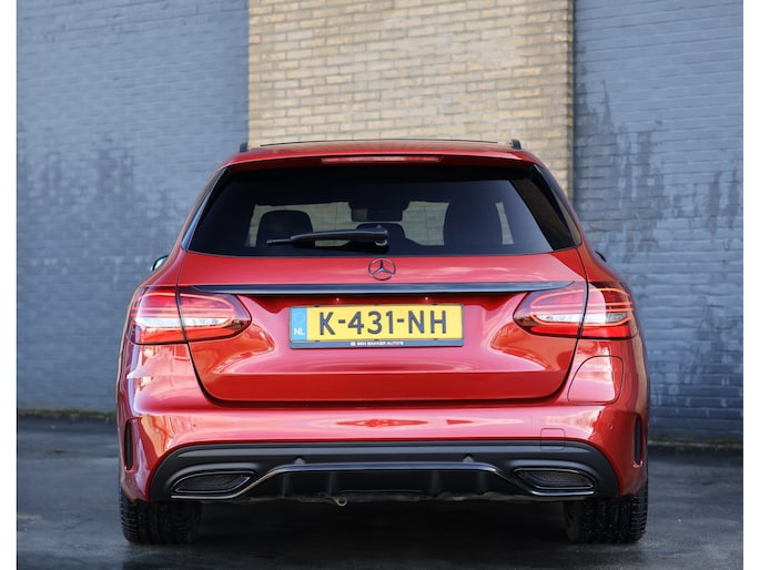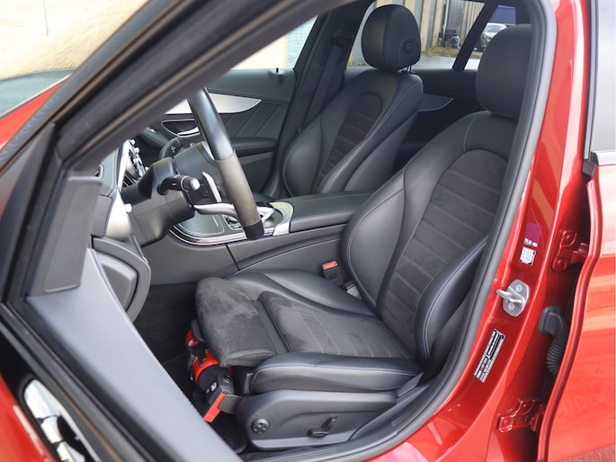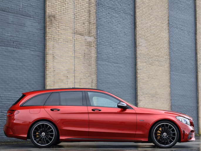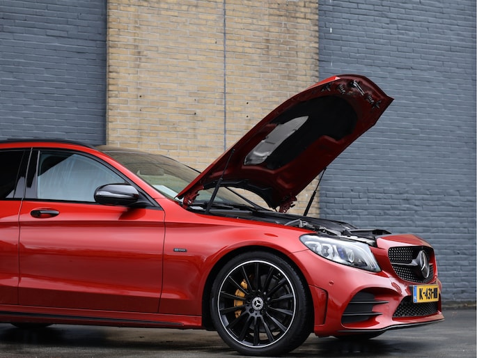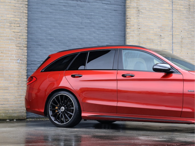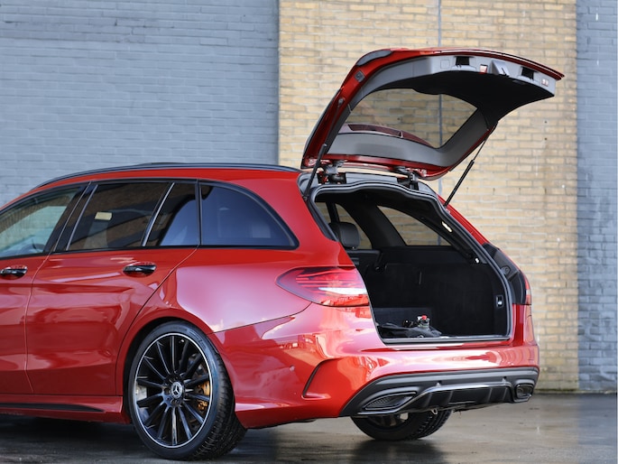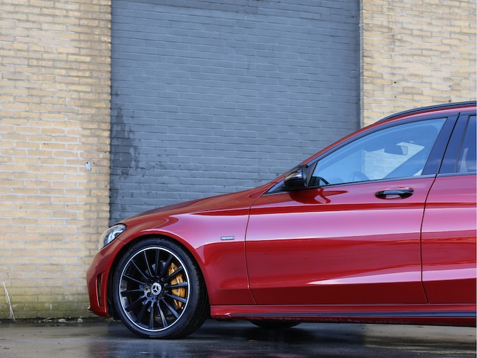 Het eerste wat opvalt is zonder twijfel de kleur. Het prachtige Hyacinth Red metallic lakwerk geeft deze C-Klasse een exclusieve en bijna zeldzame uitstraling. Afhankelijk van het licht verandert de tint subtiel van diep robijnrood naar een warme metallic gloed. In combinatie met het Night pakket, de hoogglans zwarte accenten en de 19 inch zwarte AMG multispaaks lichtmetalen velgen, staat hier een Estate die er gespierd en stijlvol tegelijk uitziet. Het AMG Line exterieur met sportieve bumpers en bredere wielkasten maakt het plaatje compleet. Dit is een auto die net zo goed voor de deur van een restaurant in de stad past als op de linkerbaan van de Autobahn.