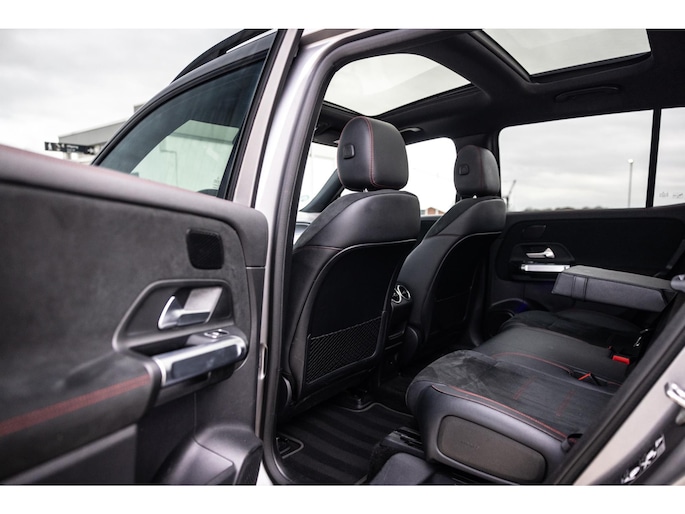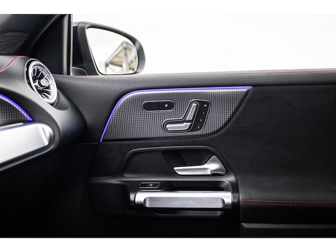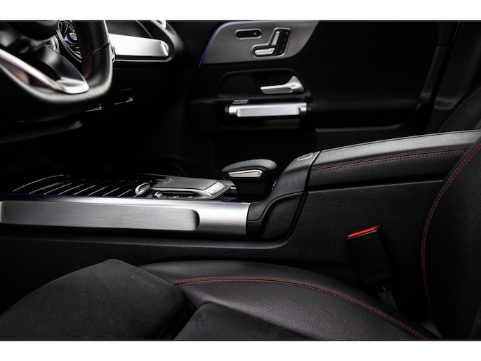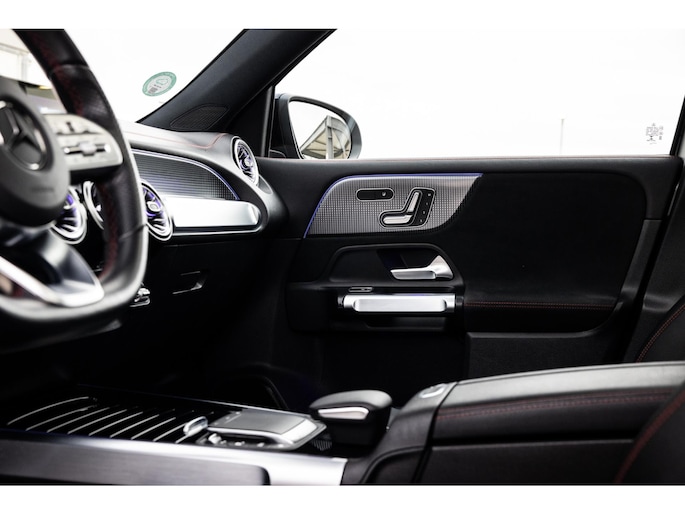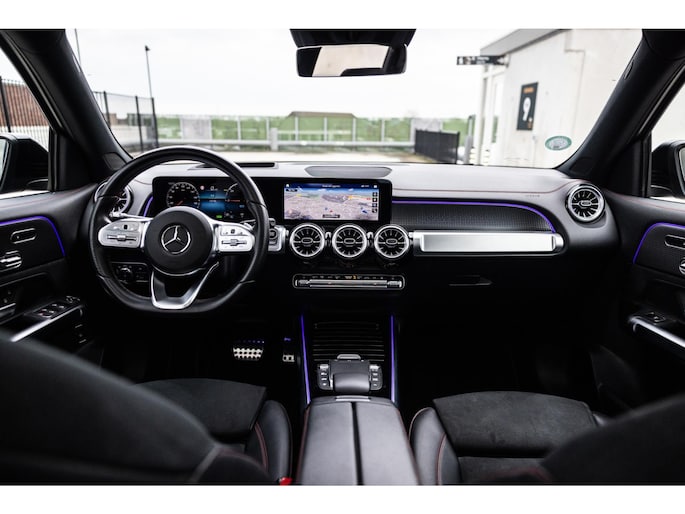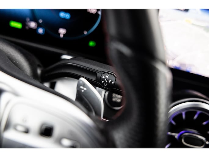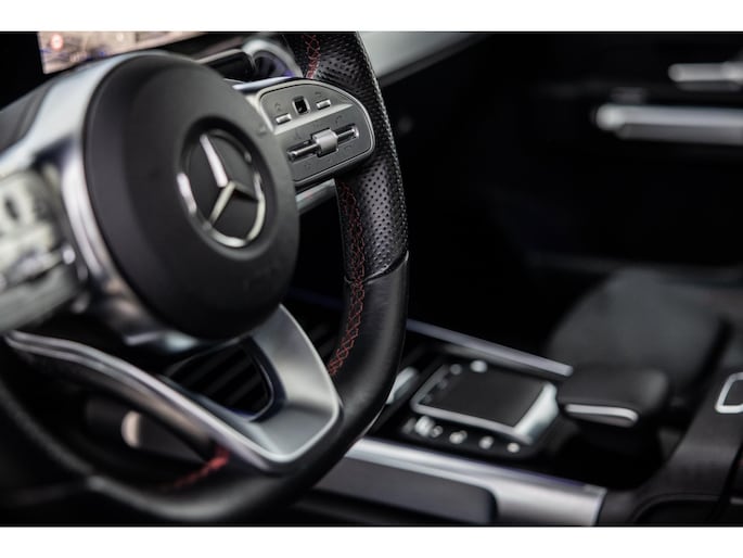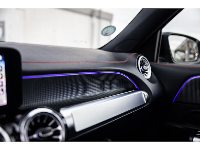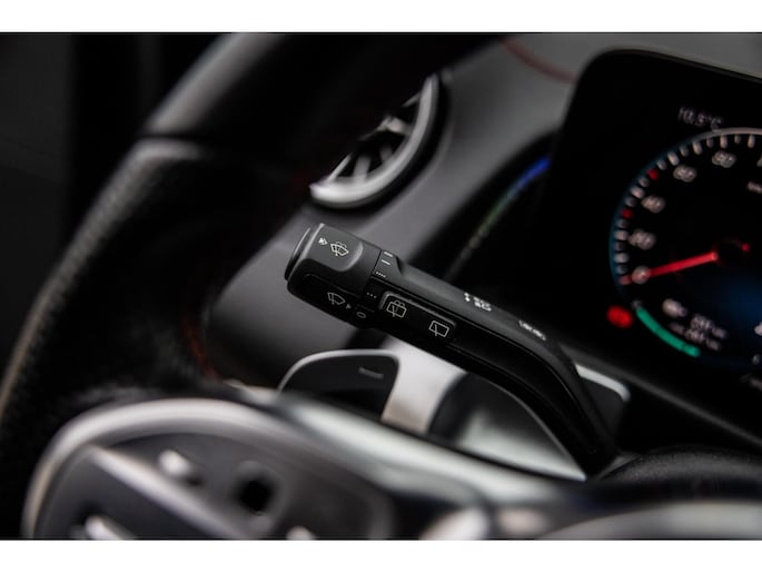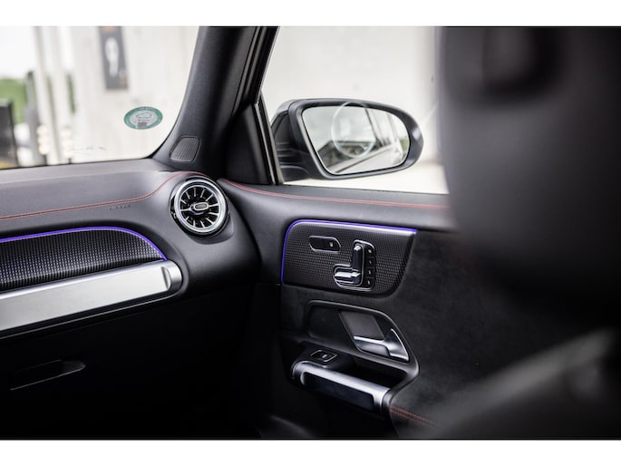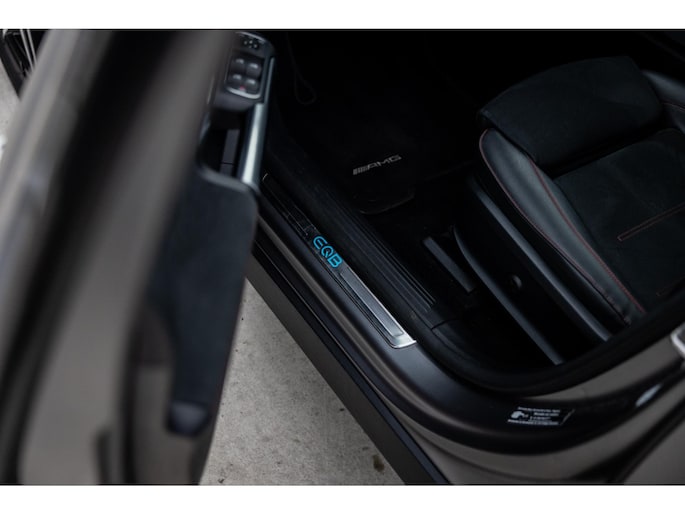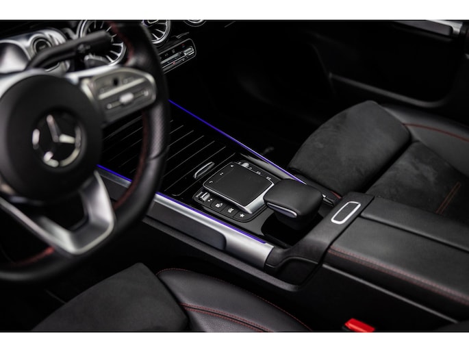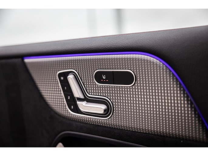 Binnenin is het één en al luxe. Eveneens voorzien van AMG Line en Advanced Plus pakket met alle luxe van dien. Zo zetel je voorin op voortreffelijke sportstoelen met elektrische verstelling, memorystanden en stoelverwarming. Het design is prachtig met zwart leder, alcantara en rode stiknaden. Ook de fraaie sfeerverlichting die in ieder gewenste kleur is in te stellen maakt indruk. Naast de prachtig verlichte lijnen in het interieur zijn zelfs de ventilatieroosters voorzien van verlichting. Opvallend is het brede scherm. Het multimediasysteem beschikt over oneindig veel instellingen, navigatie, rijassistenten en een 360° camerasysteem. In de voorruit wordt belangrijke informatie geprojecteerd door het head-up display en boven je prijkt een prachtig dubbel panoramadak waarvan het voorste deel elektrisch te openen en te kantelen is. Uiteraard voorziet het AMG pakket in zwarte hemelbekleding en sportieve geslepen aluminium sierlijsten. Het sportstuurwiel heeft een mooi design en zit vol knoppen voor bediening van de multimedia en adaptieve cruise control. Naast deze adaptive cruise zijn er nog vele rijassistenten zoals grootlicht assistent, dodehoek detectie en automatisch inparkeren. De kofferklep is elektrisch – handsfree – te openen.