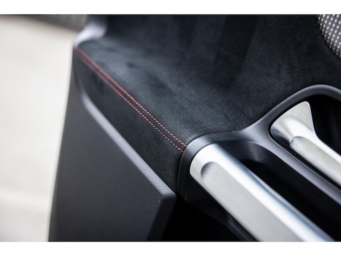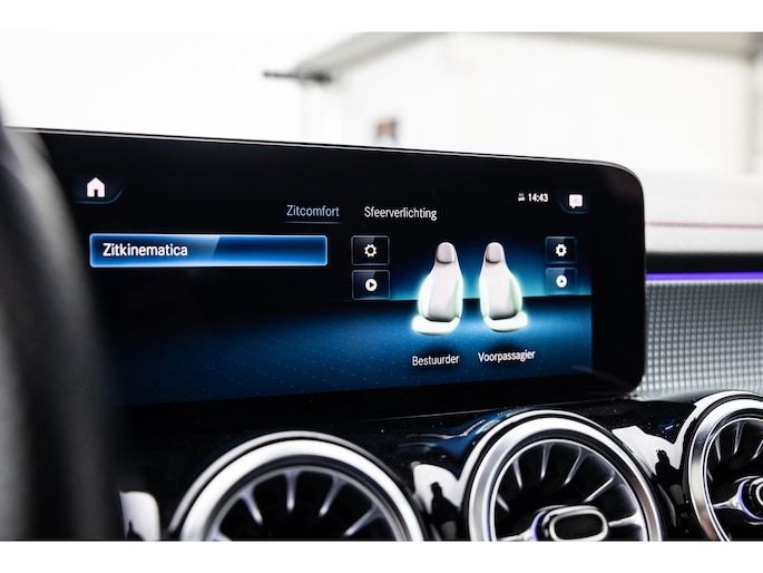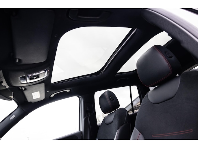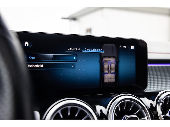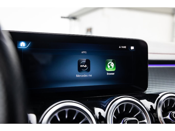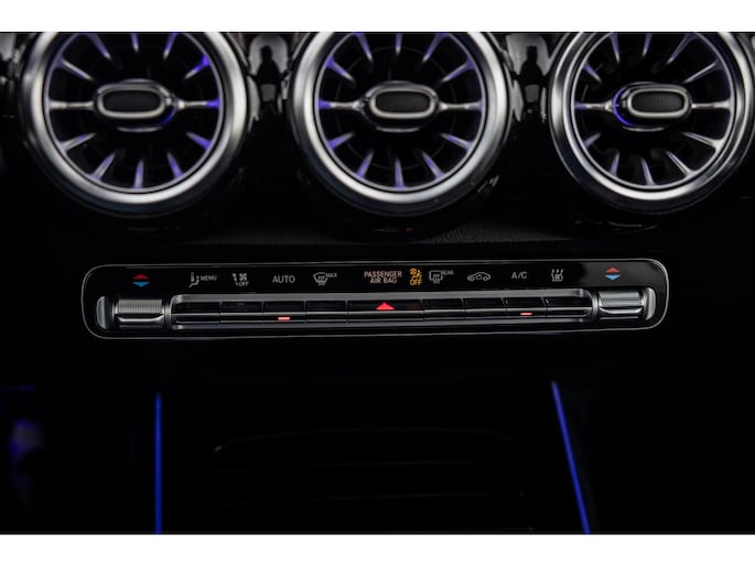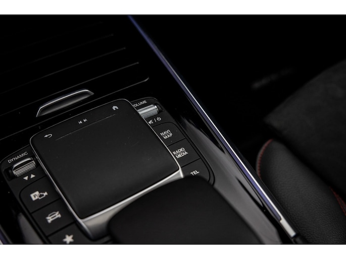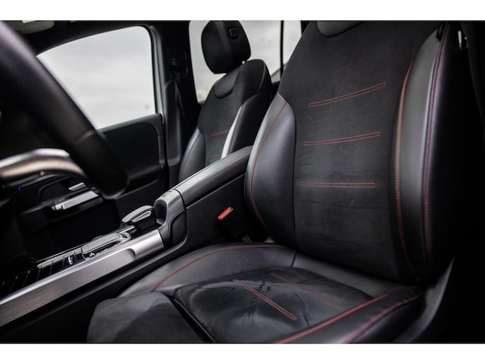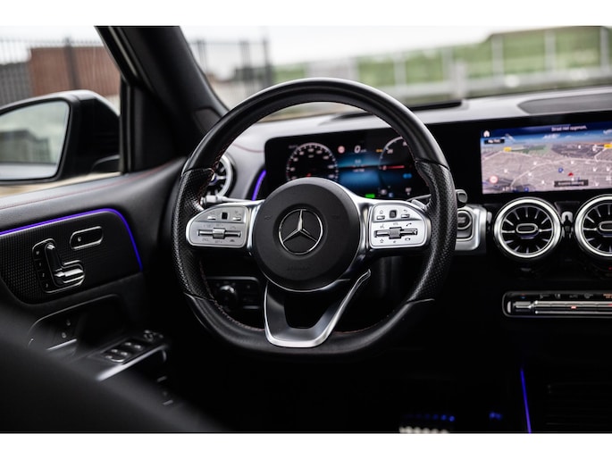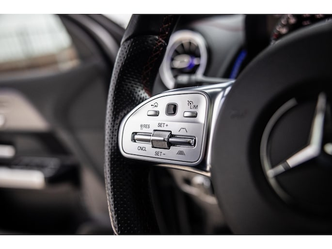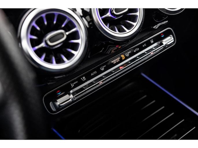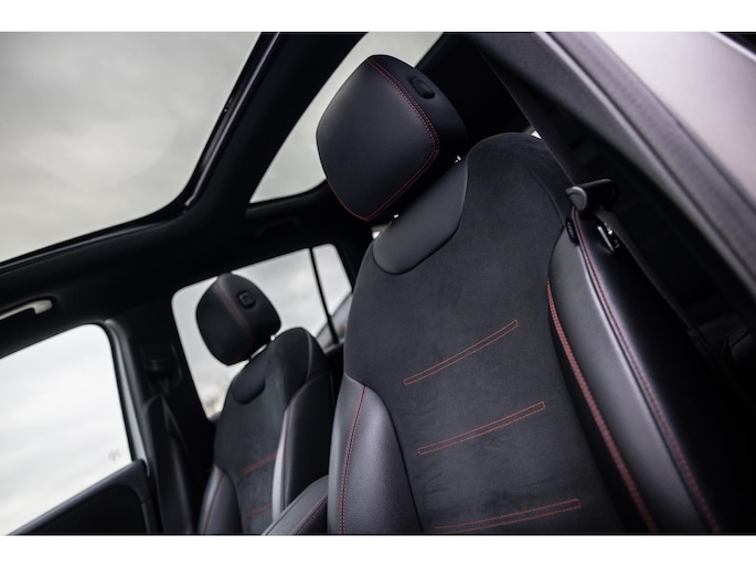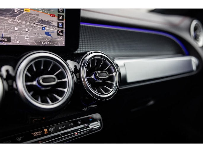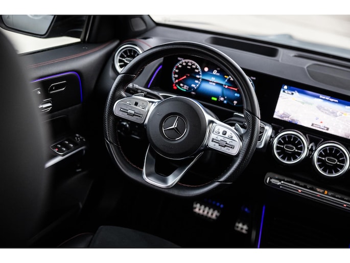 Binnenin is het één en al luxe. Eveneens voorzien van AMG Line en Advanced Plus pakket met alle luxe van dien. Zo zetel je voorin op voortreffelijke sportstoelen met elektrische verstelling, memorystanden en stoelverwarming. Het design is prachtig met zwart leder, alcantara en rode stiknaden. Ook de fraaie sfeerverlichting die in ieder gewenste kleur is in te stellen maakt indruk. Naast de prachtig verlichte lijnen in het interieur zijn zelfs de ventilatieroosters voorzien van verlichting. Opvallend is het brede scherm. Het multimediasysteem beschikt over oneindig veel instellingen, navigatie, rijassistenten en een 360° camerasysteem. In de voorruit wordt belangrijke informatie geprojecteerd door het head-up display en boven je prijkt een prachtig dubbel panoramadak waarvan het voorste deel elektrisch te openen en te kantelen is. Uiteraard voorziet het AMG pakket in zwarte hemelbekleding en sportieve geslepen aluminium sierlijsten. Het sportstuurwiel heeft een mooi design en zit vol knoppen voor bediening van de multimedia en adaptieve cruise control. Naast deze adaptive cruise zijn er nog vele rijassistenten zoals grootlicht assistent, dodehoek detectie en automatisch inparkeren. De kofferklep is elektrisch – handsfree – te openen.